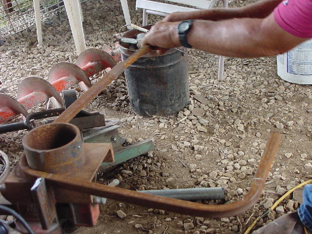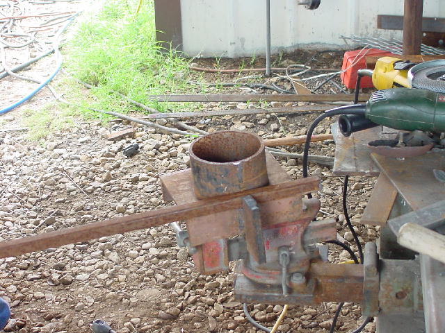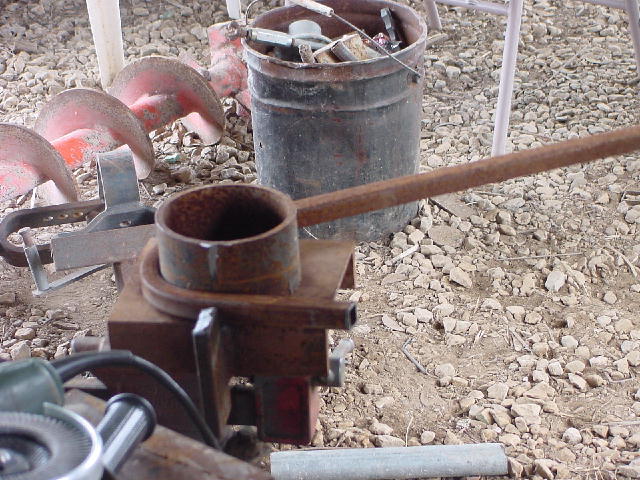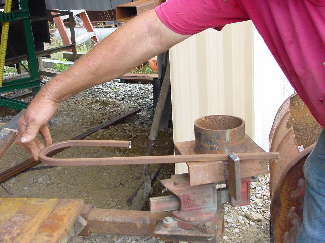 This is the ultimate simple bending jig for half inch and three quarter inch square tubing. It consists of a piece of four inch o.d. tubing welded to a piece of six inch channel. Underneath the channel is welded a piece of bar stock. The reason for the bar stock is to have something for the vise to clutch.