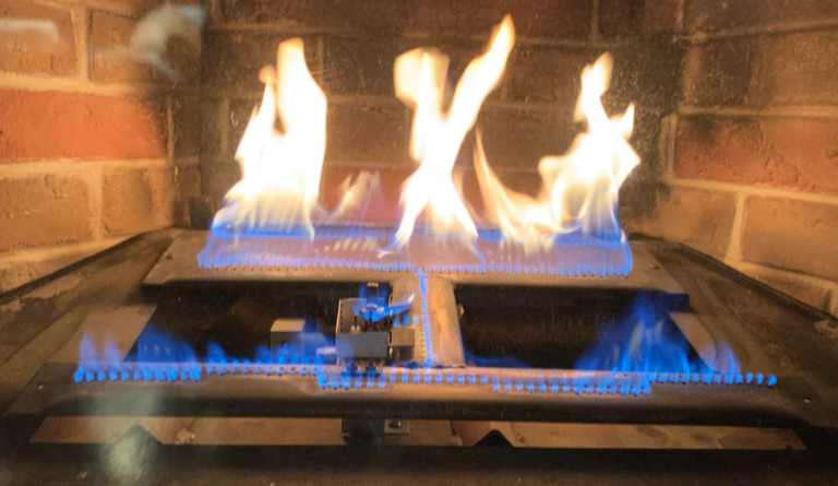 We have a 10 year old gas fireplace, propane. The front burner has very low blue flames but the back burner has nice natural flame look. This morning, the front burner did not even come on at all. Shut it down and restarted. Small front blue flames returned.