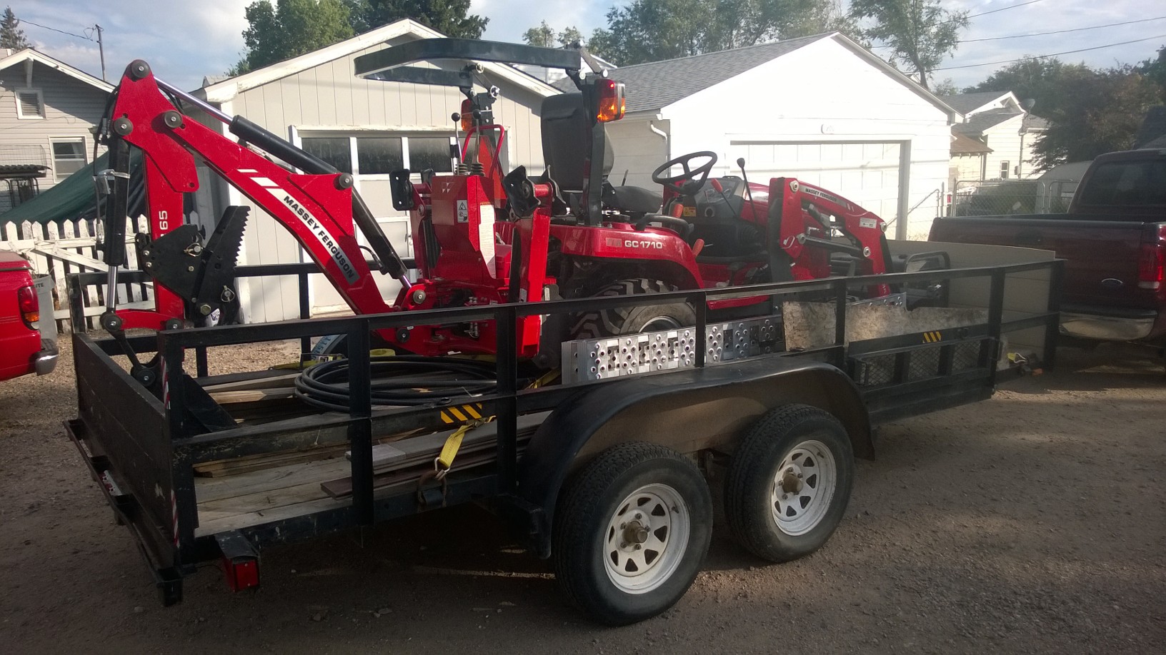 Just measured mine, rops done is about 60". With the backhoe boom locked with the pins about 70". You can drop the boom/bucket to the deck of the trailer and you should be ok to fit. The annoying thing is that the rops "rests" on the backhoe boom when its down.