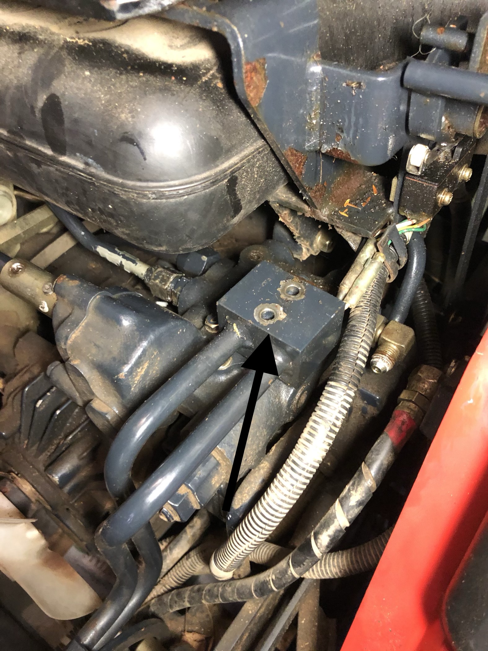 There isn稚 much room to work and the pipe connections on the side of the valve are hard to get at. And the darn roll pin seems to be really stuck. See picture with arrows. I removed the connection on top of the valve that feed the front bucket etc.