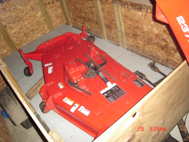 DC3- here's a pic of the MMM removed, with its driveshaft still attached. That's the way I keep it during the summer, but for winter storage (on edge, with some wheels), I remove the driveshaft/U-joint and store it elsewhere. (That's where the "Mower Deck" comes in....)