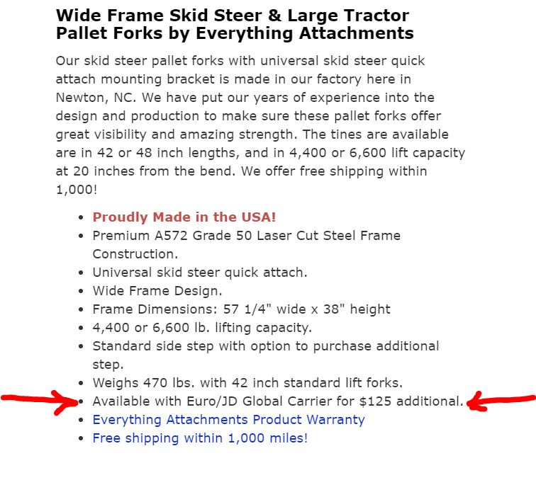 The regional Deere dealer chain does offer Frontier loader attachments but if you simply ask for a loader attachment, they will sell you one made by a (very good) regional manufacturer unless either that manufacturer doesn't make the attachment you are asking for or you specifically ask for a Frontier-branded attachment. The regional manufacturer charges a little over a grand for a set of 4000# Global pallet forks which is why the Deere (and also the regional CNH dealers) use them instead of their own manufacturers' attachments.