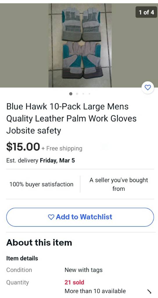 Someone mentioned gloves. I'm hard on gloves, got these today from Ebay, hard to beat for $1.50/pair! Leather palm & fingers and large enough. I'm sure they're made in China but 10 pair should last me a while.View attachment 687698View attachment 687699View attachment 687700