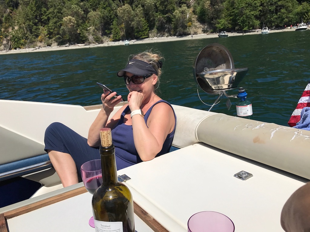 Last day of shrimping was grand. Finished at the 1pm 'pots out of the water' deadline. Didn't limit but did very well. Shortly after, we got the little shipboard bbq ready and were drifting and... we had a stealthy visitor go by...