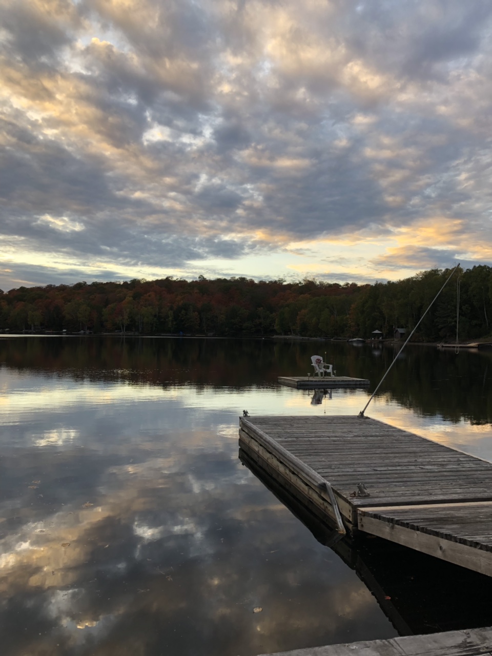 Leaves have pretty much peaked. Lovely misty morning yesterday as the sun rose over the hill behind us and crept down the trees across the bay. Then another nice view down at the dock after sunset.
