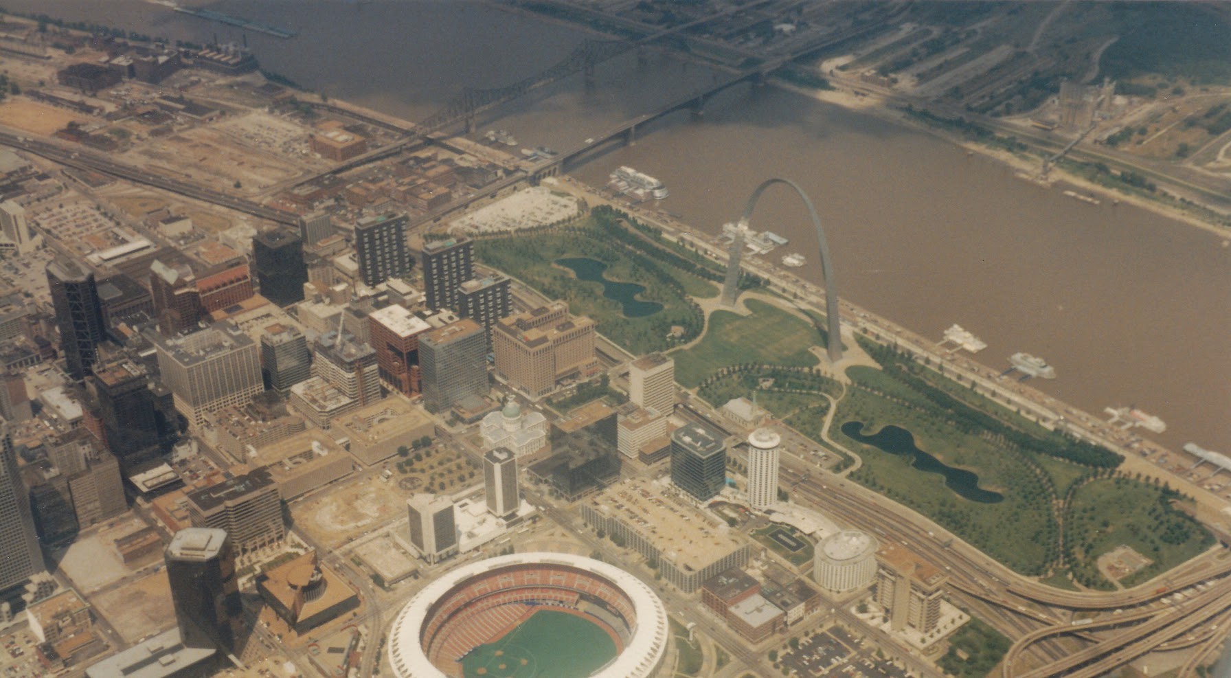 Wow, yeah, that's old. The old Busch Stadium (2), no dome stadium yet on the Cervantes Convention Center, Kiener Plaza just west of the Old Court House is still an empty lot, and all those boats still on the river front. The Admiral steam boat, just south of the Eads Bridge, was still in operation in 1987 when I turned 21, and my first Wife and I took a cruise on it for my birthday. That thing was huge. I believe it has since been dismantled. The Goldenrod Showboat, which I believe is second from the south leg of the Arch, had been docked elsewhere for years, with several groups trying to get it restored. It was destroyed a couple of years ago by a "mysterious" fire.