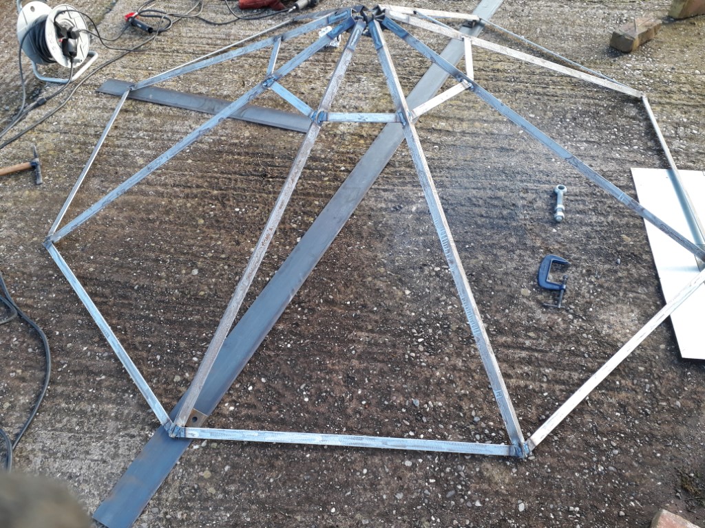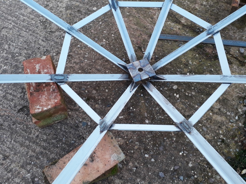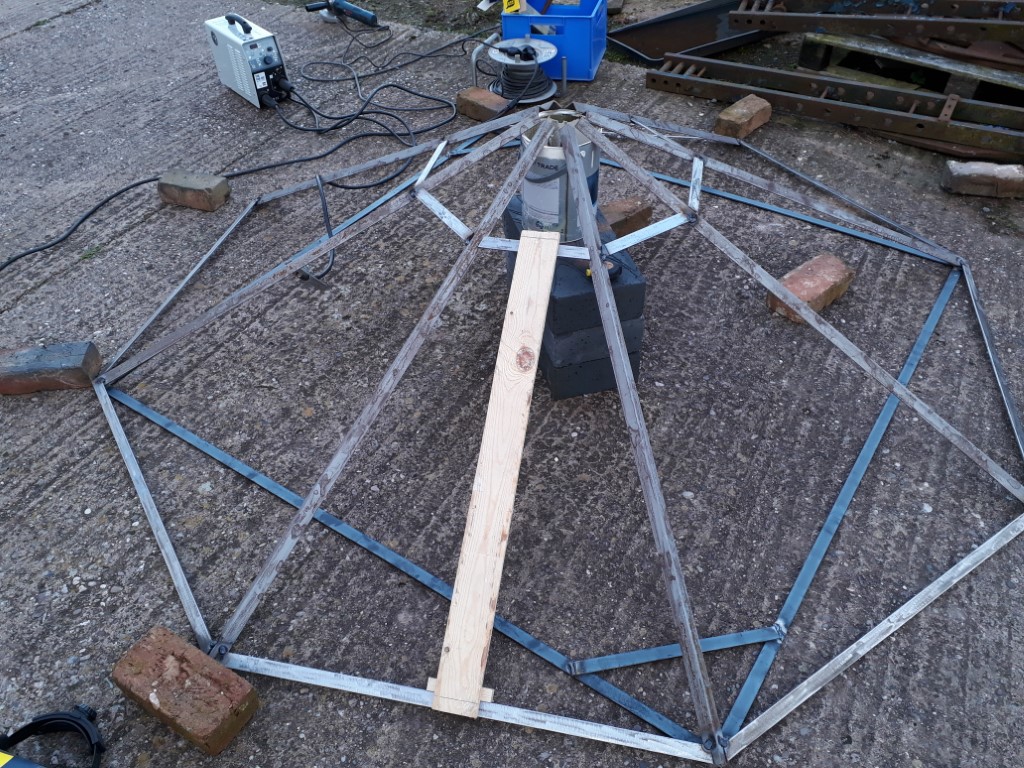 In retrospect I should have made this top piece before anything else and used it to align all the ribs instead of balancing them on an empty paint can, which meant nothing was firm until all 8 pieces were tacked into place. I hadn't anticipated quite how difficult it would be for a novice fabricator like me to get all 8 sides equal, or how tight it would be to poke in a welding rod to some of the welds on the underside.