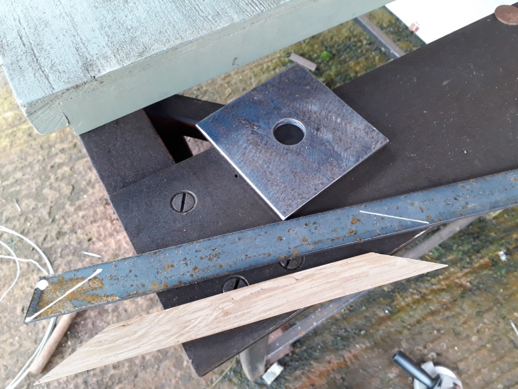 A few days ago I started to make something to hold the top of the water tank cover together and yesterday was dry enough to let me get out and finish it off. The thing is starting to get heavy so it needed to incorporate a lifting eye to one day suspend it from the FEL to lower it into place. After sketching different ideas I settled on a square plate to which are attached 8 short steel bars, each angled so they could be welded into the V of the angle iron. A piece of wood made a good trial and error (with lots of errors!) template.