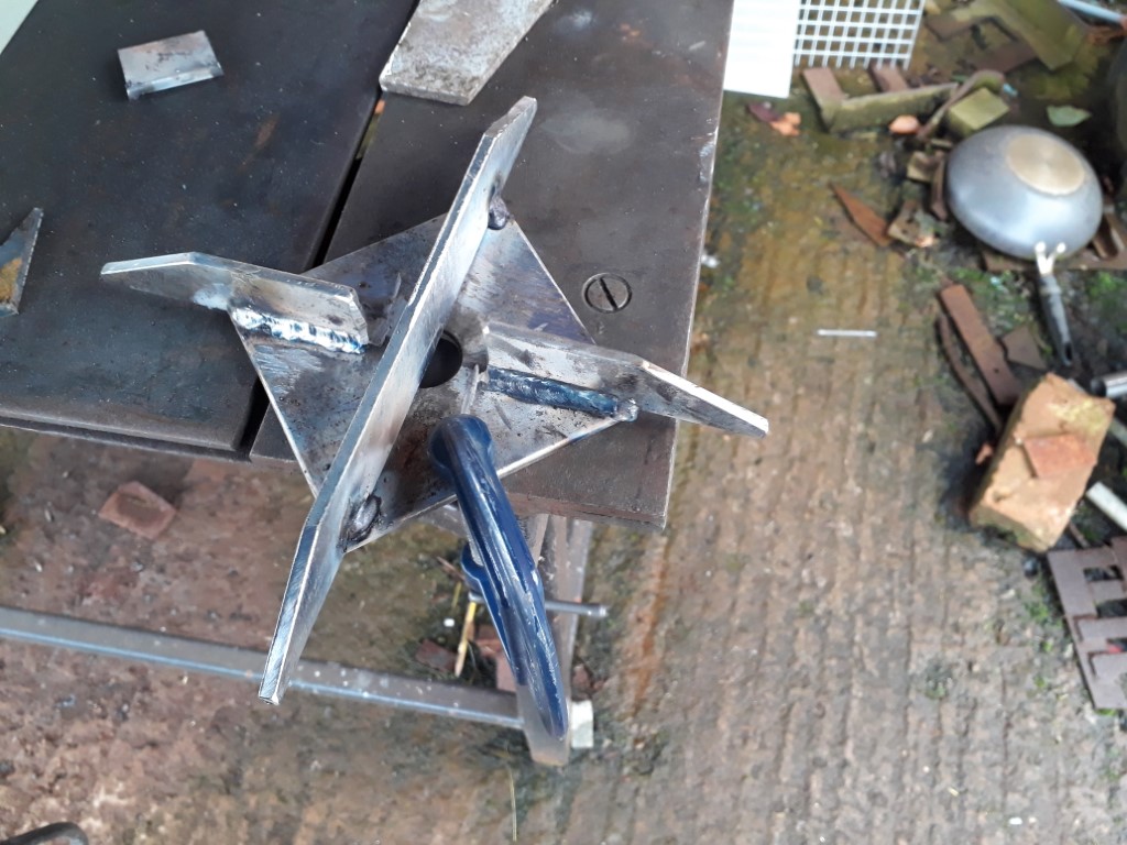 A few days ago I started to make something to hold the top of the water tank cover together and yesterday was dry enough to let me get out and finish it off. The thing is starting to get heavy so it needed to incorporate a lifting eye to one day suspend it from the FEL to lower it into place. After sketching different ideas I settled on a square plate to which are attached 8 short steel bars, each angled so they could be welded into the V of the angle iron. A piece of wood made a good trial and error (with lots of errors!) template.