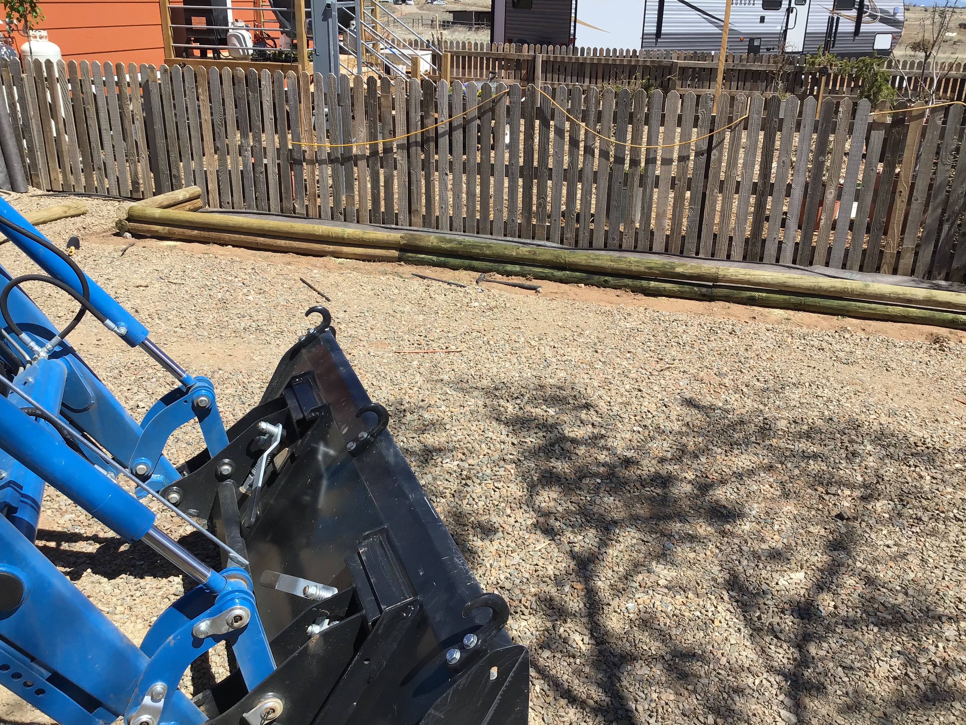Taking a break now from the landscaping.... temp has now exceeded the forecast, reading 78 now.... a couple of pics of the timbers going down, drilled holes every 4 ft for rebar, I still need to pound them in ... then fill with mulch.