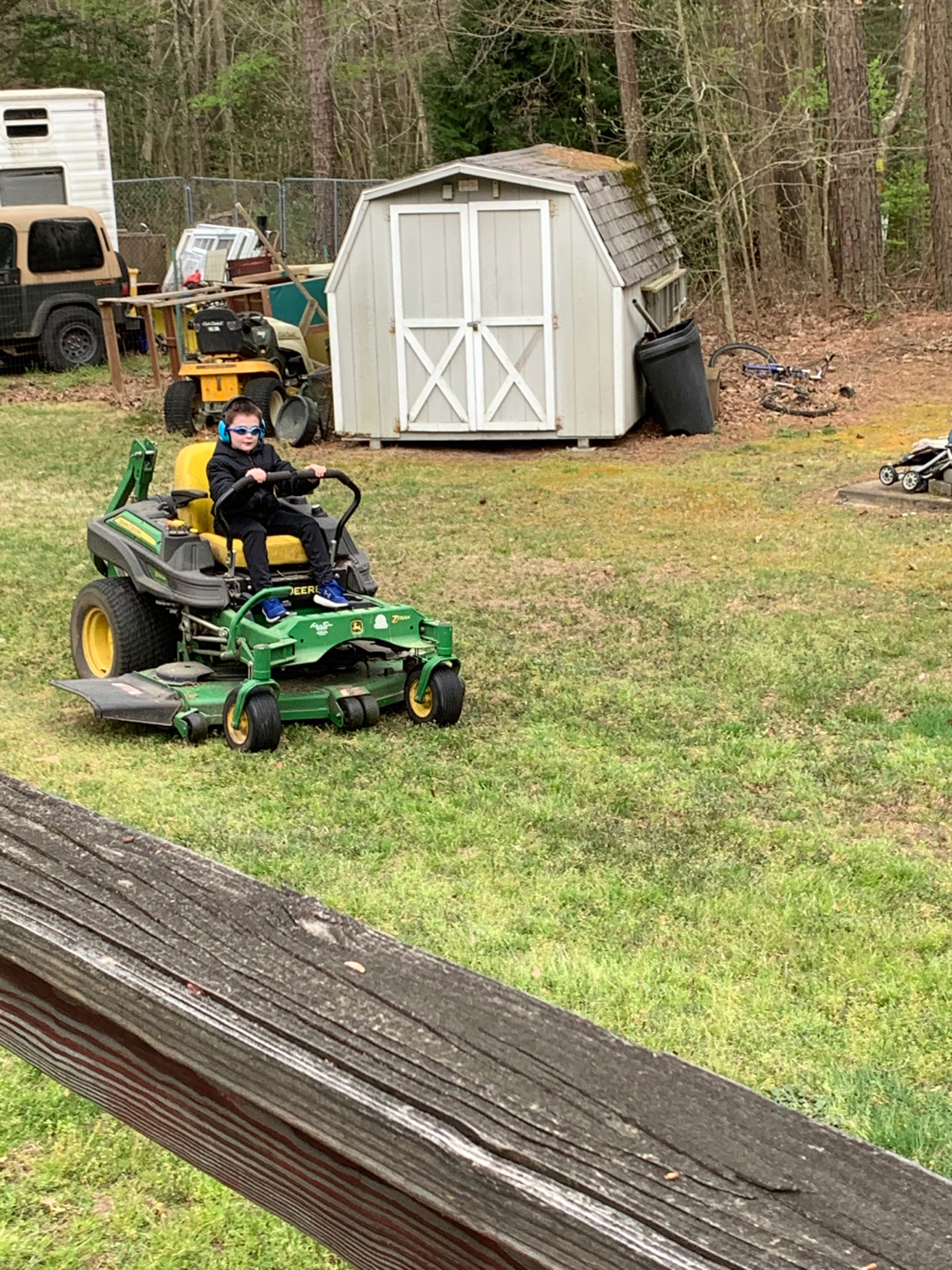 My 8 year old grandson mowing his yard. The junk you see is their neighbor. He’s been ordered to clean it up multiple times. Obviously not enforcing it.
