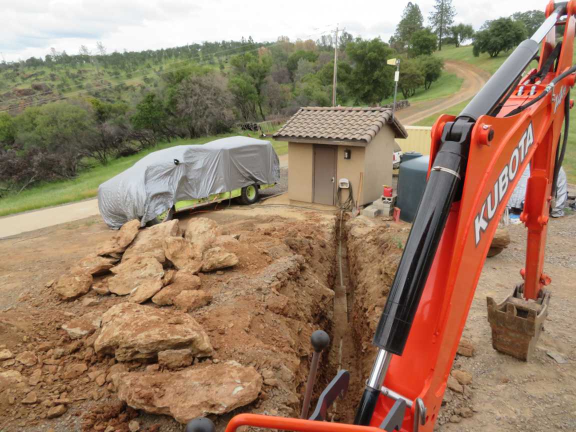 I opened the main breaker before I started digging this time, and this was the view at the end of the day. I only had a handful of rocks on the left when I started, but I had a wealth of them by quittin' time. Kinda fun in a challenging way figuring out how to get them in the backhoe bucket, I guess once the thumb gets installed it won't be any fun anymore.:confused2: Really slowed down and concentrated, too, working on smooth movements, and moving two and sometimes even three valves simultaneously. When I'd get jerky again, I'd slow down until it smoothed out. No more broken conduit, and by the end of the day I had the right amount of curl figgered out on the bucket to get it to skim along the top of the conduit and clean it off along the bottom of the trench. That also involved lifting the boom, then uncurling the bucket to keep the angle of the teeth just right. Another kind of challenging fun, and by the end of the day I was mentally wiped out. Time for some of Jay's therapy!