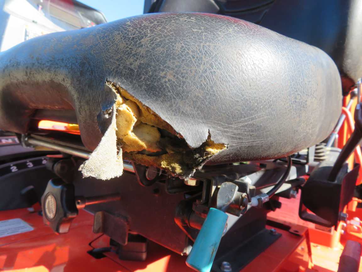 I knew about this torn seat corner before the purchase, but i've been thinking more lately about how to fix it. It was caused when someone let the TPH links rise high enough to raise the trap door that is the floor on the backhoe, then couldn't figure out how to get them back down again. Instead, they just kept hitting the seat corner on the sheet metal every time they spun the seat around.:grumpy: