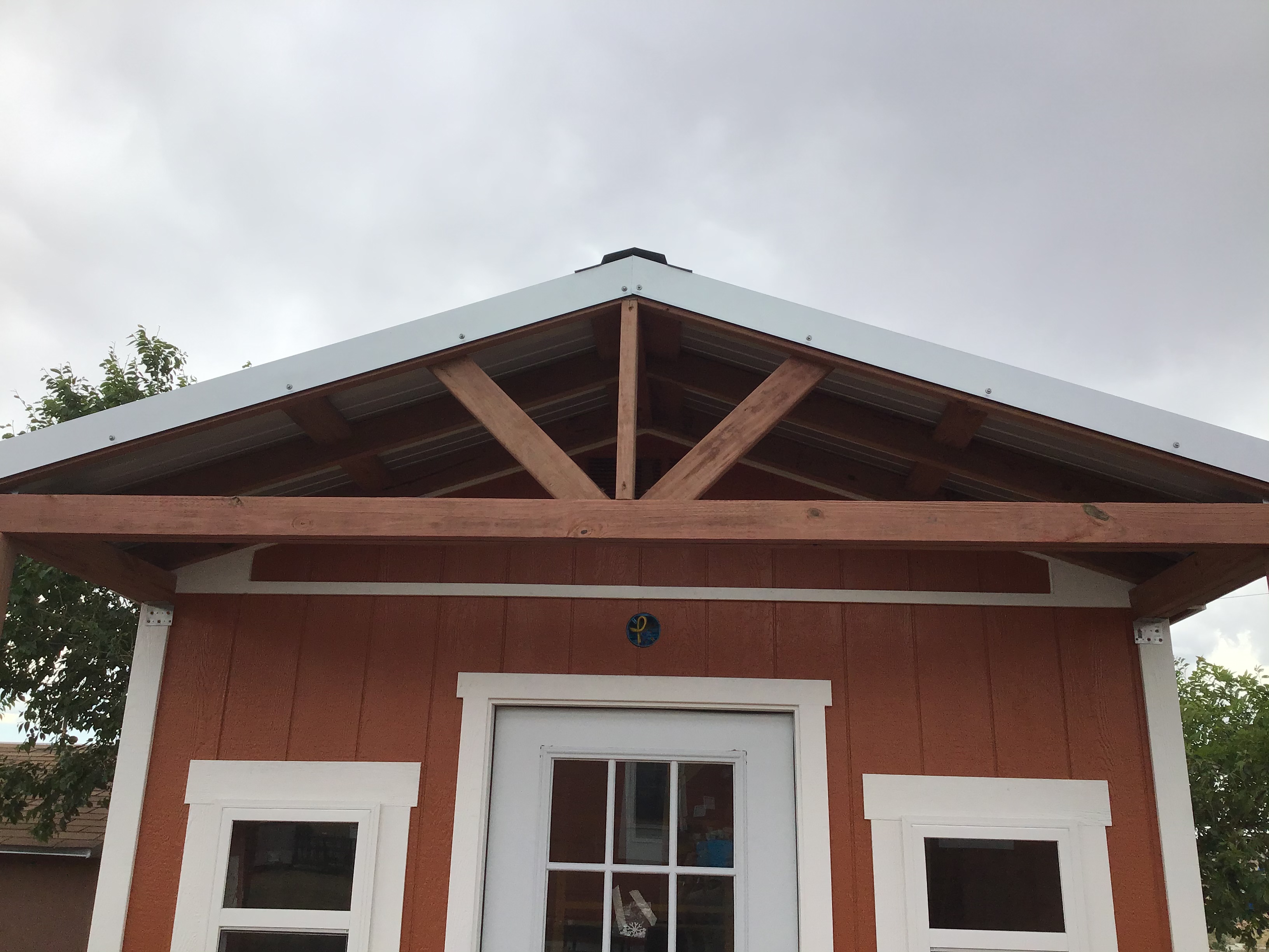 I was able to finish 98% of the hobby shack porch roof yesterday, just a few pieces of drip edge to be installed and a few screws up on the roof that I could not reach from the scaffold.