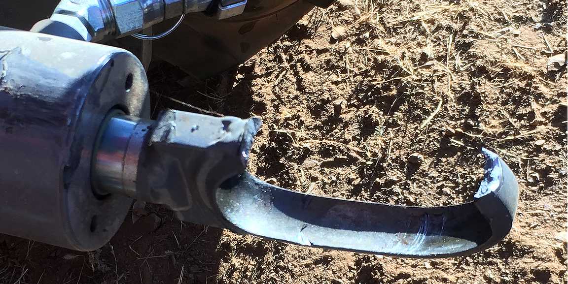 First blood on the new Kubota. That's what's left of the outboard eye on the hydraulic top link. When I was shutting down for the day yesterday, I pulled the top and side links in as far as they would go, and slowly lowered the 3PH lifting arms to put the lower corner of the box blade on the ground. Then pushed the lifting arm (draft) control all the way down. That's when I heard a bang, and the eye got transformed into a hook no longer attached to the box blade. Looking at the cross section of the fracture surface, it was only a matter of time. There's not enough metal there. The eye contained a sphere that was cross drilled with two holes, one for 3/4" Cat 1 top link pins, the other for 1" Cat 2 pins. The sphere was so big it didn't leave much room for the ring that held it onto the end of the cylinder rod, so Kubota left the ring thin so it would still work with most of the 3PH equipment out there. But not work for long; I bet they're seeing a lot of these being returned. I'm probably just going to turn a new eye out of some 4130 bar stock, if I can find the stub I think I still have. But the real problem is that the hydraulics on the T'n'T are leaking down so quickly I'm having to fool with the controls every five minutes to keep the box blade from hitting the ground. At this point, I don't know if it's the valves or the cylinders that are leaking, so this morning when I go out to swap out the top link for a normal one, I'll pull in the side link cylinder all the way in and then disconnect the hoses. If it holds, it's the valve that's leaking. Then I'll hook the side link cylinder up to the top link valve and pull the cylinder in and disconnect the hoses. Then I can have a talk with the Kubota dealer on what to do next.