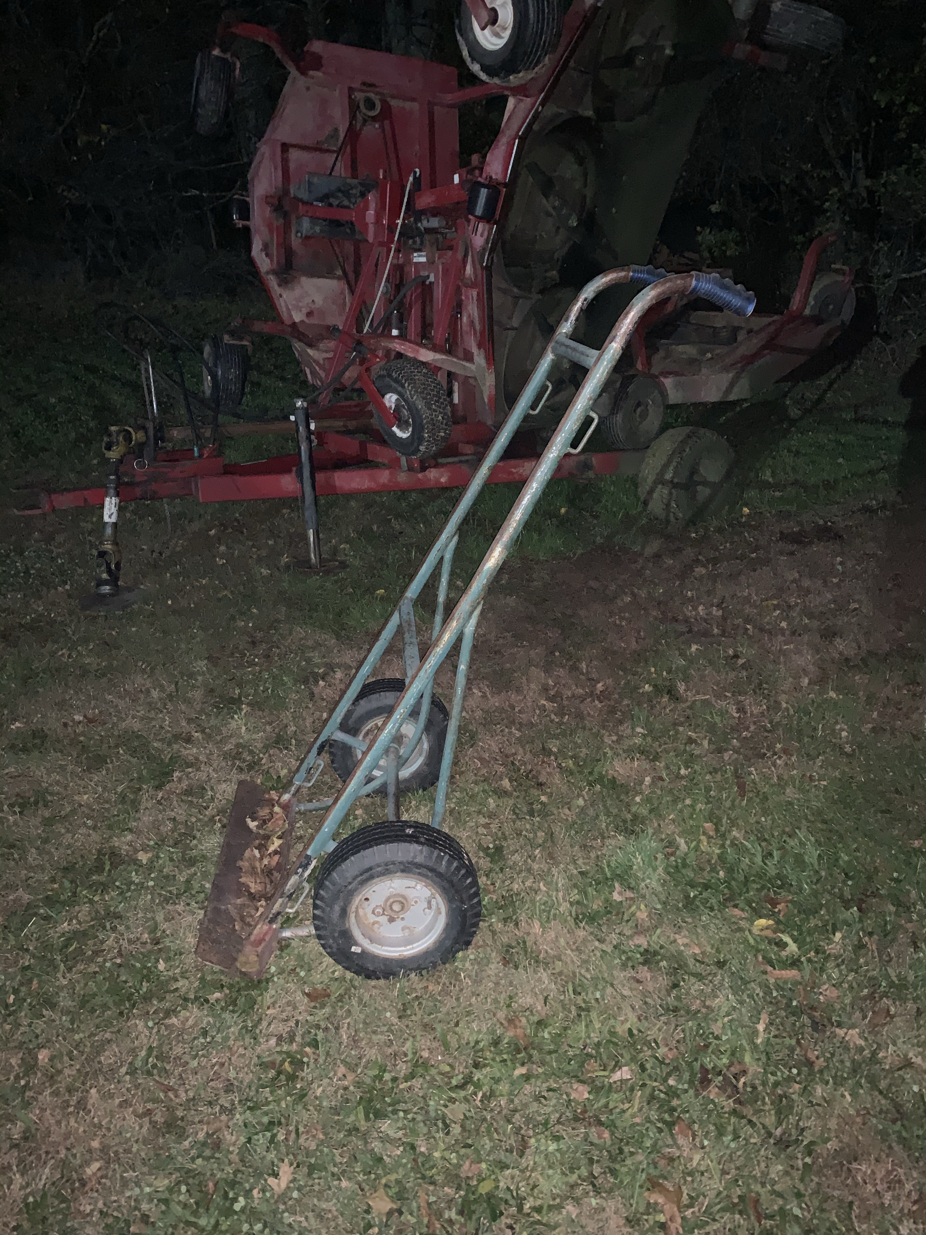 I just pulled it out of the shed, no make or model that I can see. I also have a folding one with pneumatic tires, but it’s not as heavy duty.