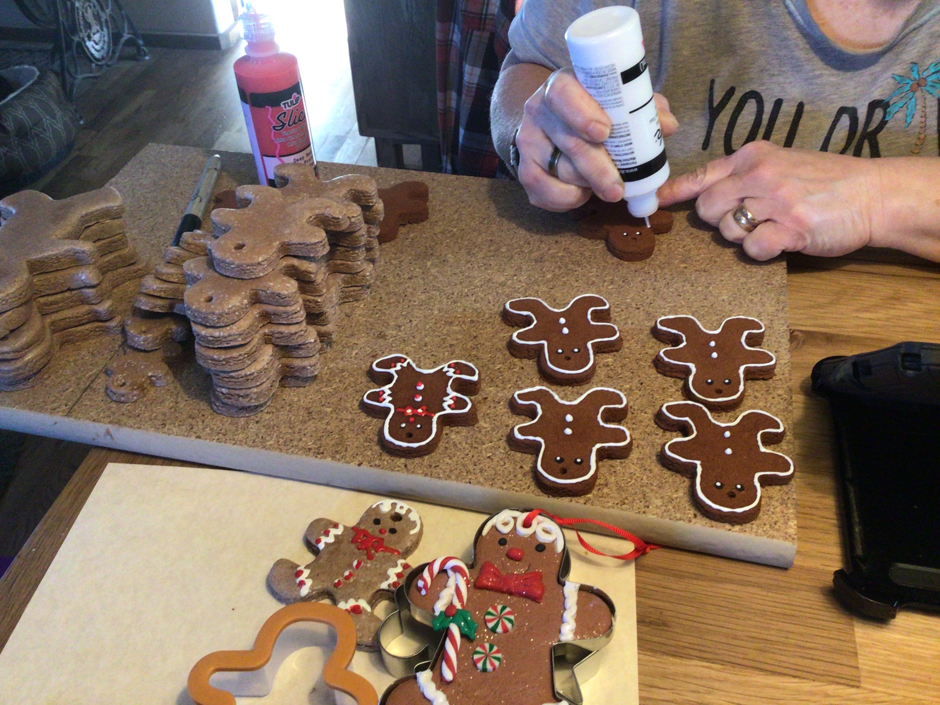 Wifey is decorating some gingerbread man decorations.... both sons attempted to eat them when they came in smelling and seeing them spread out....with a loud "NO!, they aren't edible" being exclaimed by the wifey... they do look tasty, but truly are not edible...