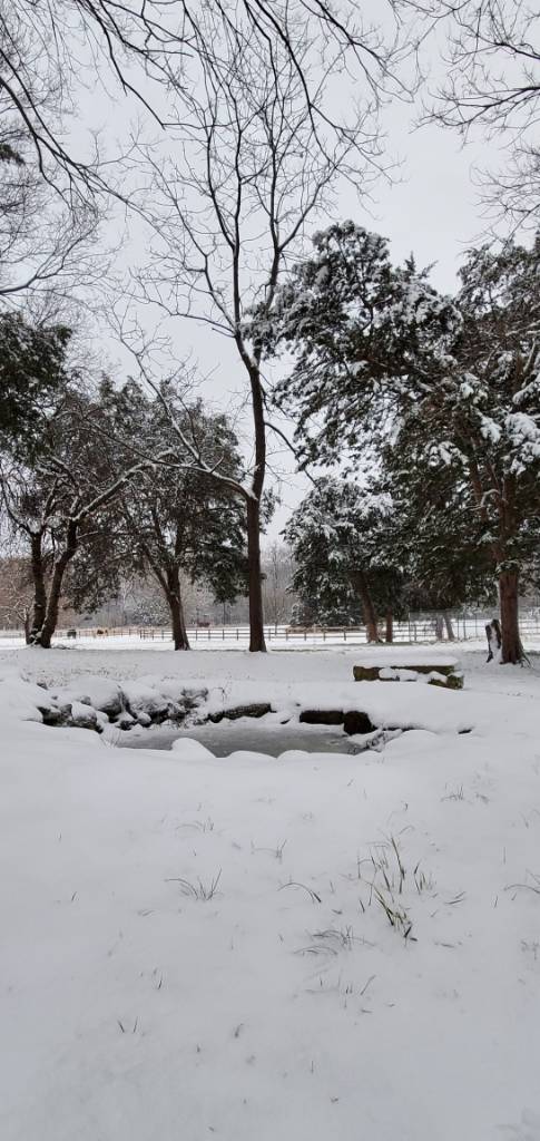 It is just cold and nasty here. I went to check on the animals and went by my koi-less pond. It was pretty. I also managed to drive down the driveway just to bust up the ice with the tractor.