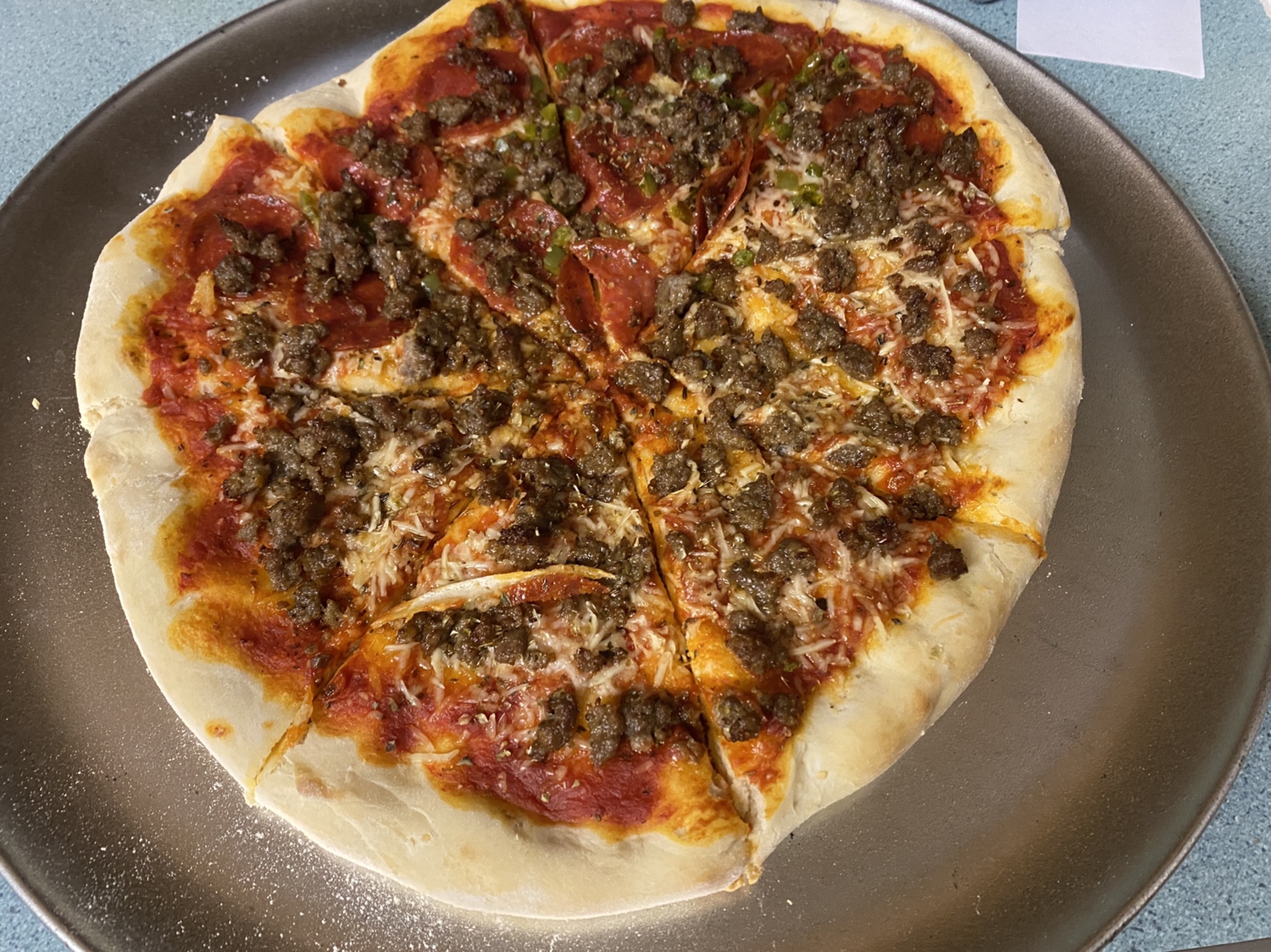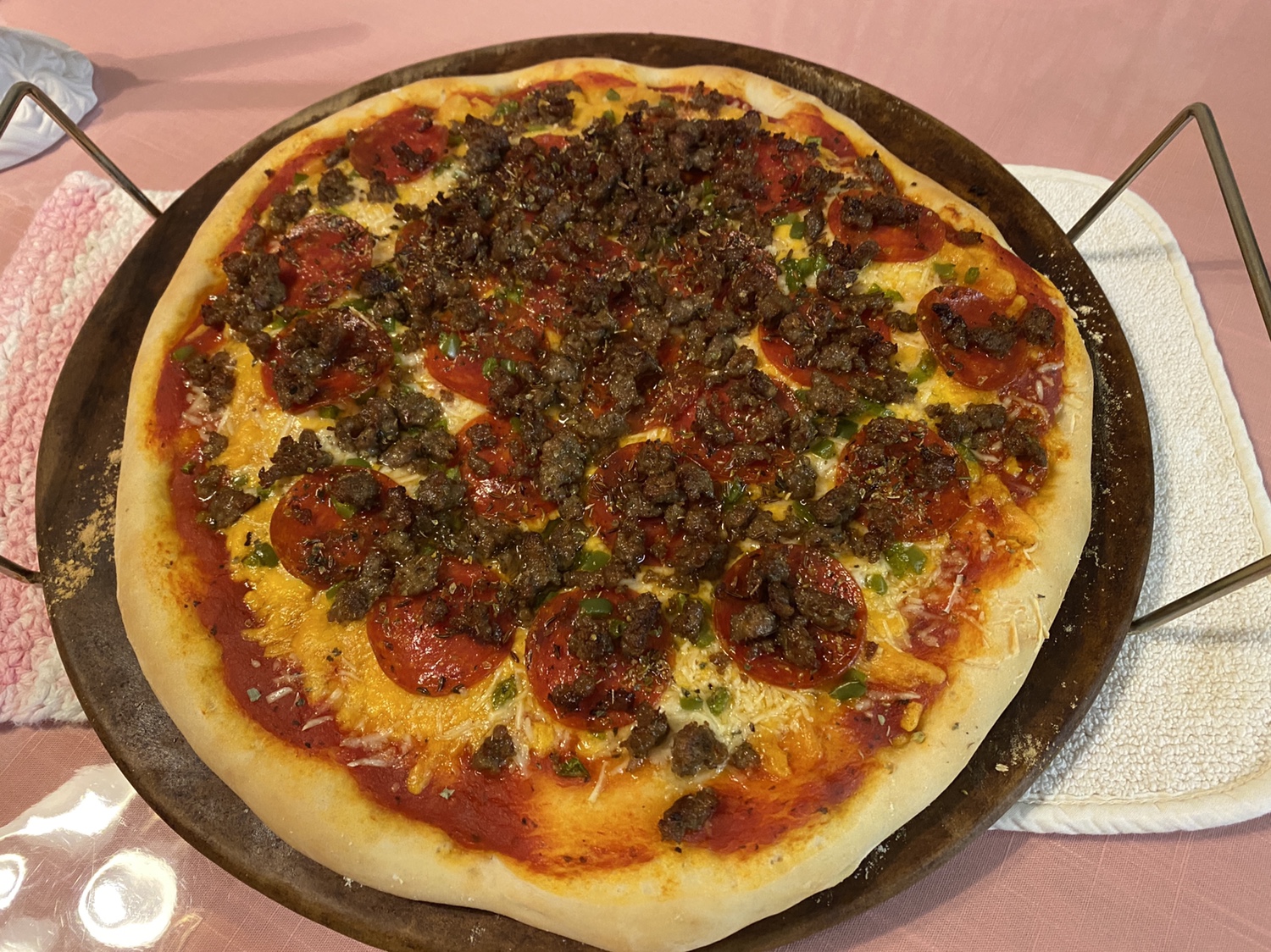 First time making homemade pizza including the dough. After I was putting on sauce, I asked where’s the cheese. Oops, forgot to get mozzarella cheese, had Parmesan and cheddar. Then added finely cut green pepper, pepperoni, sausage, sprinkled on more oregano, basil and caraway.
