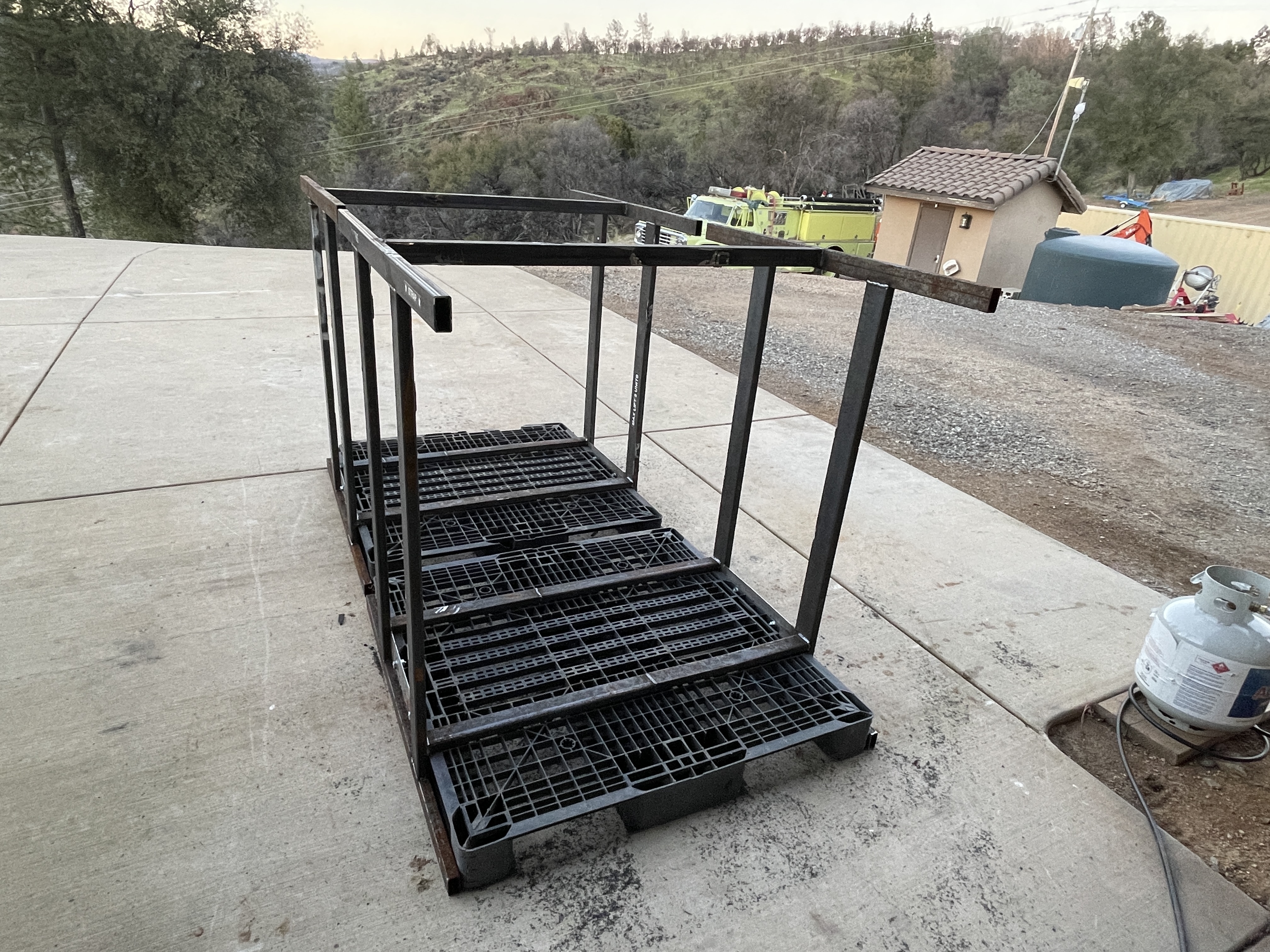 Got two more pallets welded up yesterday, so today I'll work on getting 'em filled. All that black stuff on the driveway is plastic chips left from cutting out the forklift tunnels on the pallets. First time using the battery powered circular saw, and though I wasn't impressed with the power, it sure was handy. Looks like I'm gonna need more pallets, too; I'm down to my last six.