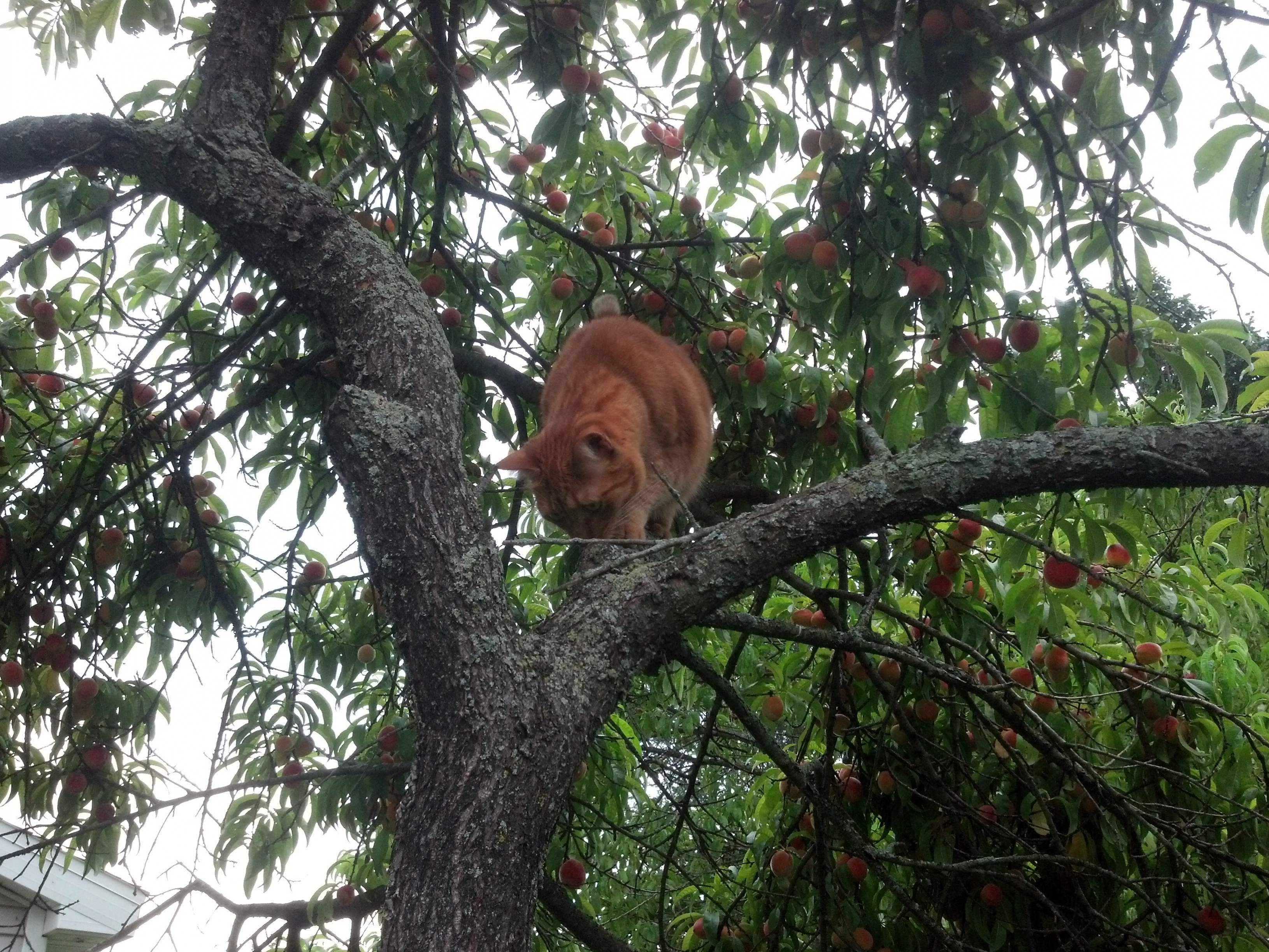 Don't envy you undergoing that procedure, I have gone through it 3 times now, it's the prep part that's the worst of it...I don't mind being hungry BUT hate sitting on the pot most of the day before the actual colonoscopy. Just came in from push mowing the past two hours, it's a nice overcast day here and an ideal 70 degrees. While pushing the mower around the trees in the south yard I kept grabbing peaches off the dwarf tree, there is a bumper crop this year and the birds and jap beetles are having a feast...my neighbors kids are trying to eat as many as they can before they are sampled. It's an Elberta peach...nearing 30 years old now. Yes, that is a cat in the tree to give you an idea of how large the tree is.