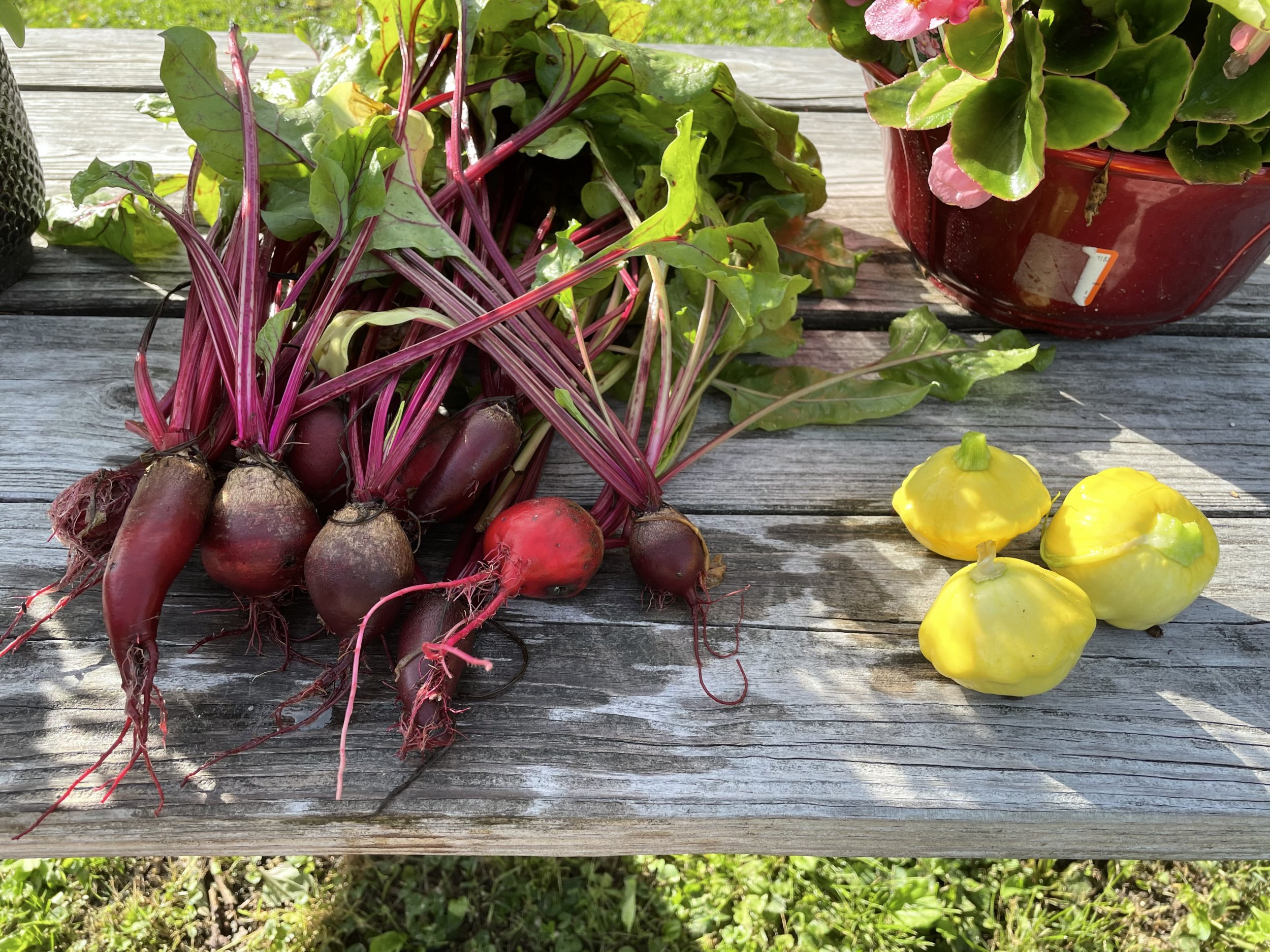 Plants in raised bed garden watered.