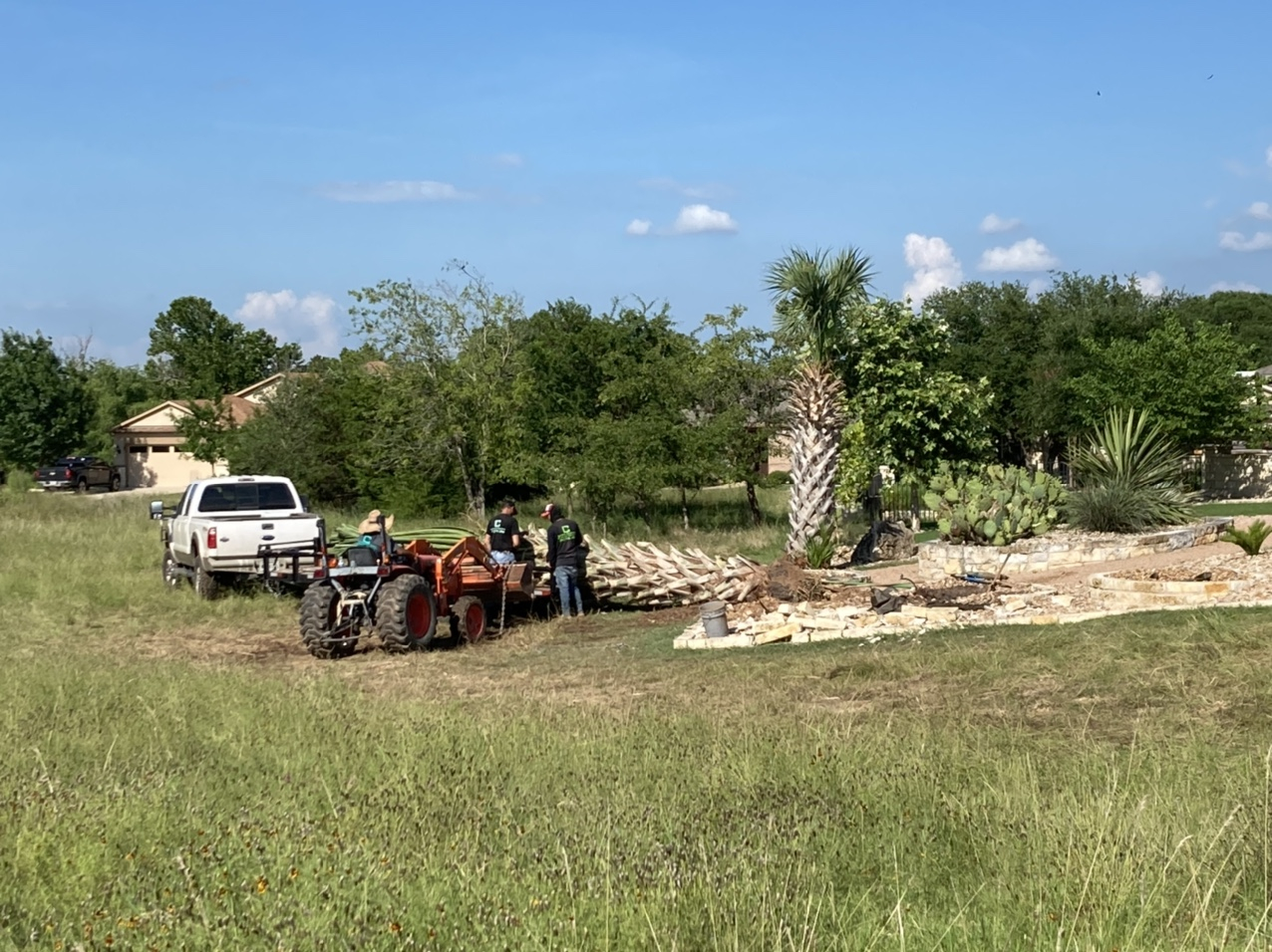 A little Kubota tractor work by landscapers in the neighborhood today. They are unloading a live palm tree to replace one that died in the big Texas freeze this last Winter. They got it unloaded and it’s laying on the ground to be set upright and planted in the morning.