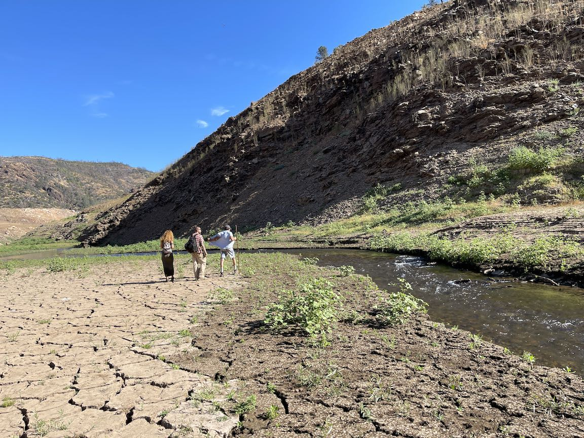 Took quite a while to get up to the narrows, where the water deepened to the point where we'd be swimming to go any farther. Next time, and there will be a next time before the rains start, I'll wear a bathing suit and running shoes, and carry a waterproof bag for the phone and lunch. In a normal year there would be at least 75 feet of water here, and when the reservoir is full, over 200'.