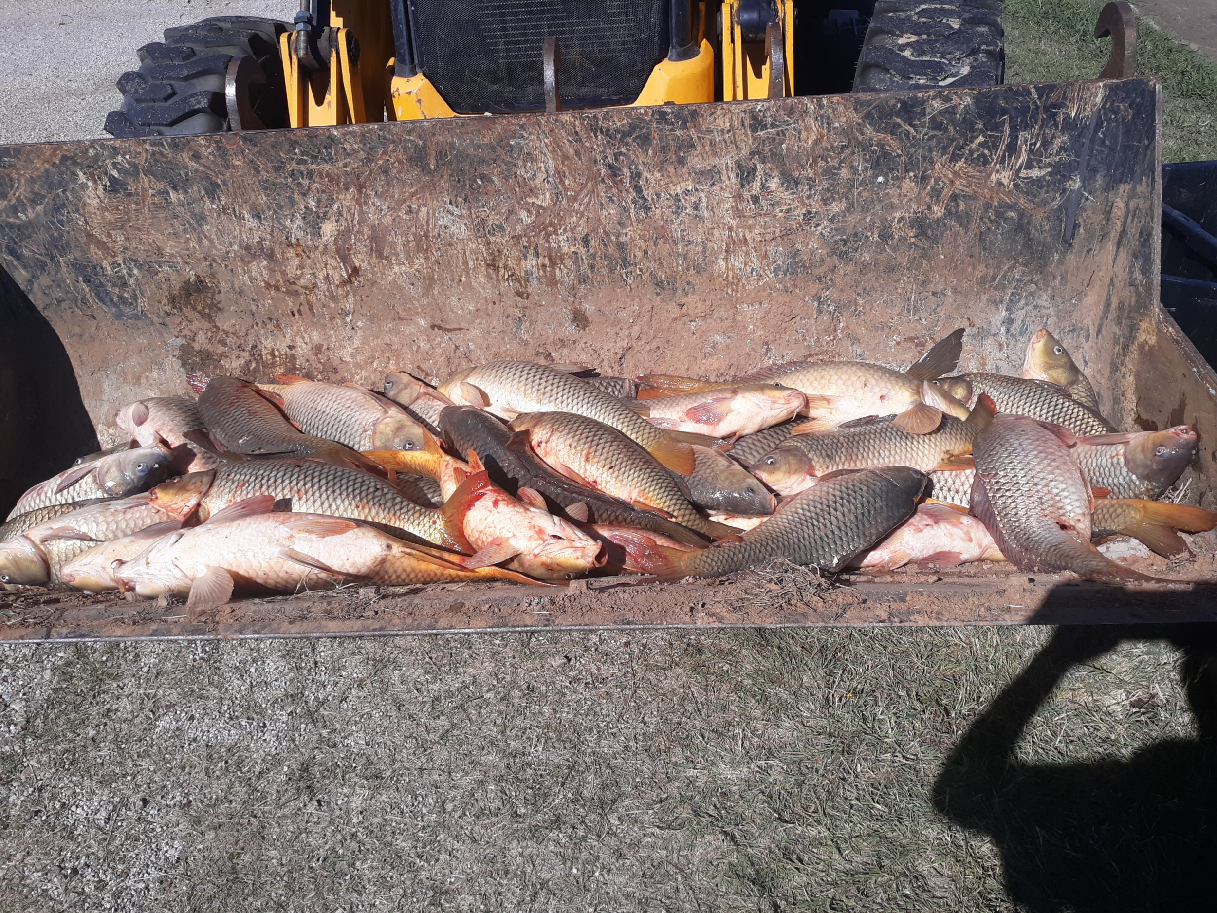 Good evening all. 52F for the start, mostly clear, light breeze. Light wind today, partly cloudy sky, and high temp was 81F, DP 51F. Boat prep for carp netting today, Fish survey(shock boat) people showed up at 11AM and it was off to shock the fish. The survey people net the large mouth bass, weigh and measure the and release them. Fish club had 2 boats to follow and remove carp and drum. Pic was after 2hours, my netter had to go to work. Much harder to drive and net. Carp only stay shocked for 5-10 seconds and were mostly close to docks. We were seeing more bait fish and young bass that had spawned in lake, had not seen much of that past couple of years. Pulled boat out of lake shortly after 3PM. Did get it backed in driveway and took short nap.