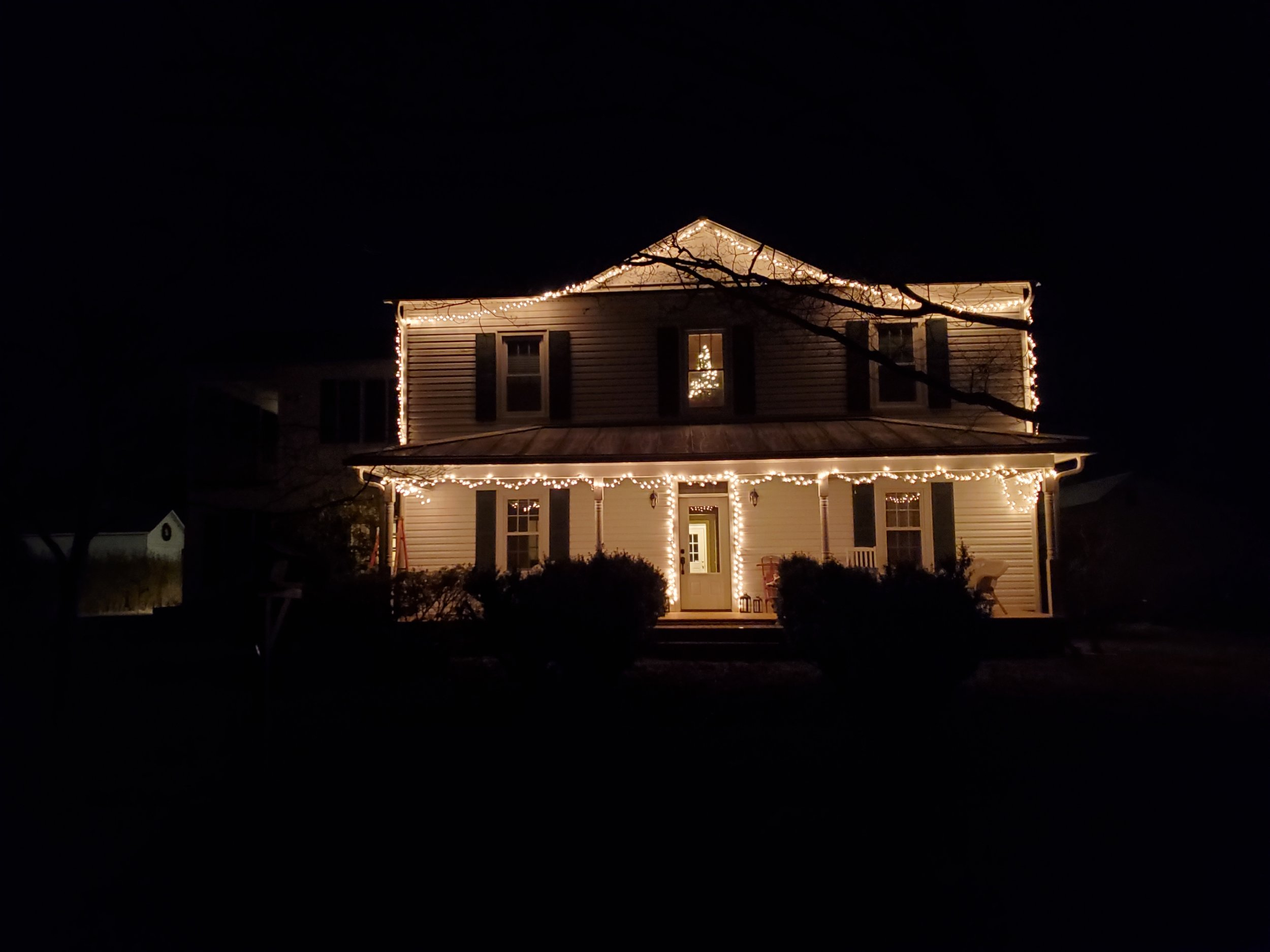 Managed to get the lights all up. My metal roof just scares the crap out of me. I should have gotten the man lift out, but the setup time and movements around the house are just not a lot of fun. Especially for a job that takes literally 5 minutes if it all goes right. Well.....more than five minutes. LOL. The metal and my sneakers just were not cooperating, and when I managed to be bold and tried to hang the lights, yeah, I just could not get them on that hook I put up. LOL.