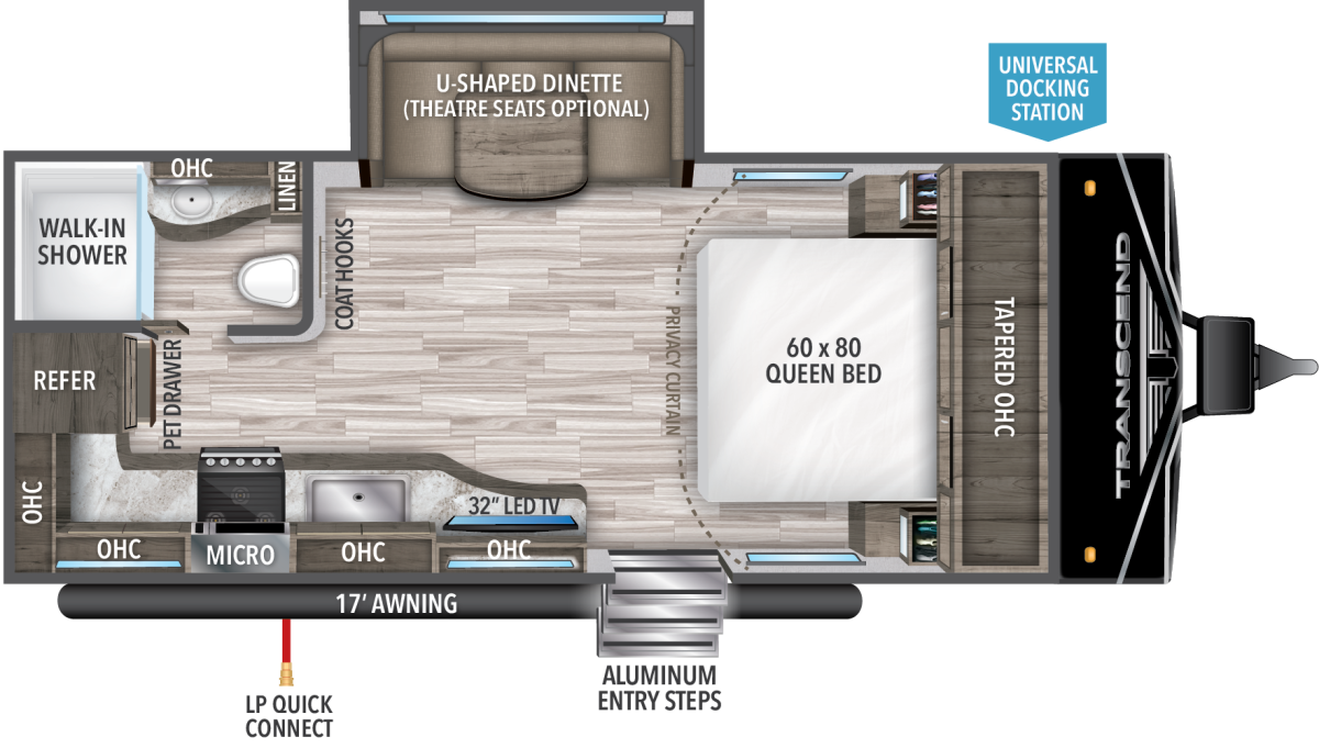 BEF, it's a 21 footer inside, overall 25'. The furnace is on the back, just right of centerline, under the fridge. The WH is on the right rear corner, perpendicular to the furnace. Here is a floorplan.