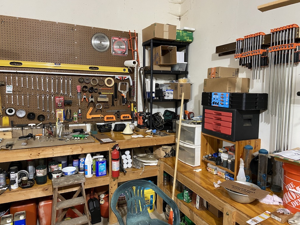 Thanks have tried lately to get better organized. When working there was little time and materials and tools ended up at the last emergency project. And many tools and materials were purchased again because I could not readily find it. And then don't forget all the "help"I had from the kids working on their projects. This is still in progress but starting to come together. At least like items are now in one place. And items stays where I put it last. Still have a row of full size cabinets full of stuff to go through.