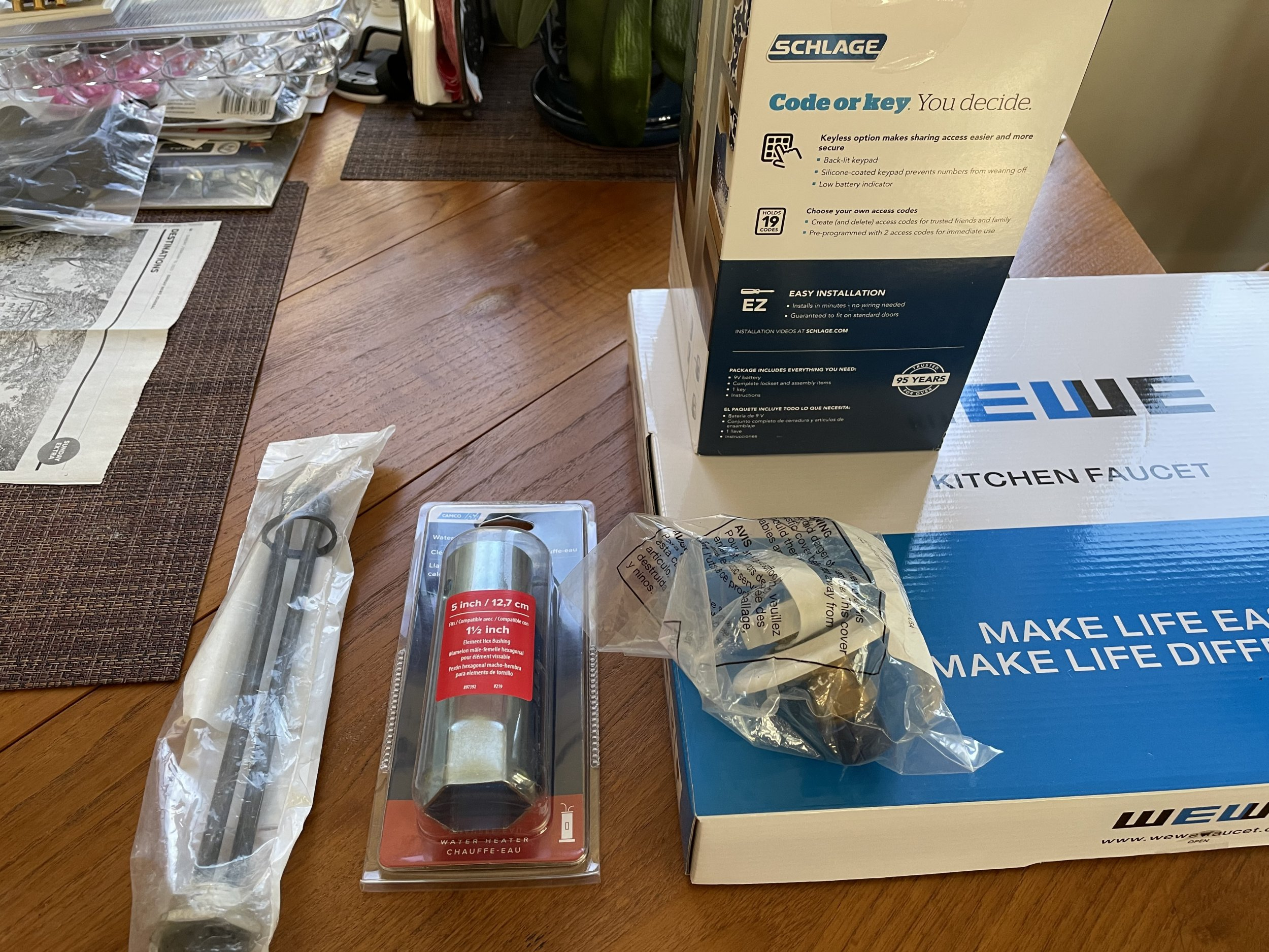got all my parts in for rv, new kitchen faucet, water inlet and hot water heater electric element. Had to buy a special (but inexpensive) 1 1/2 inch