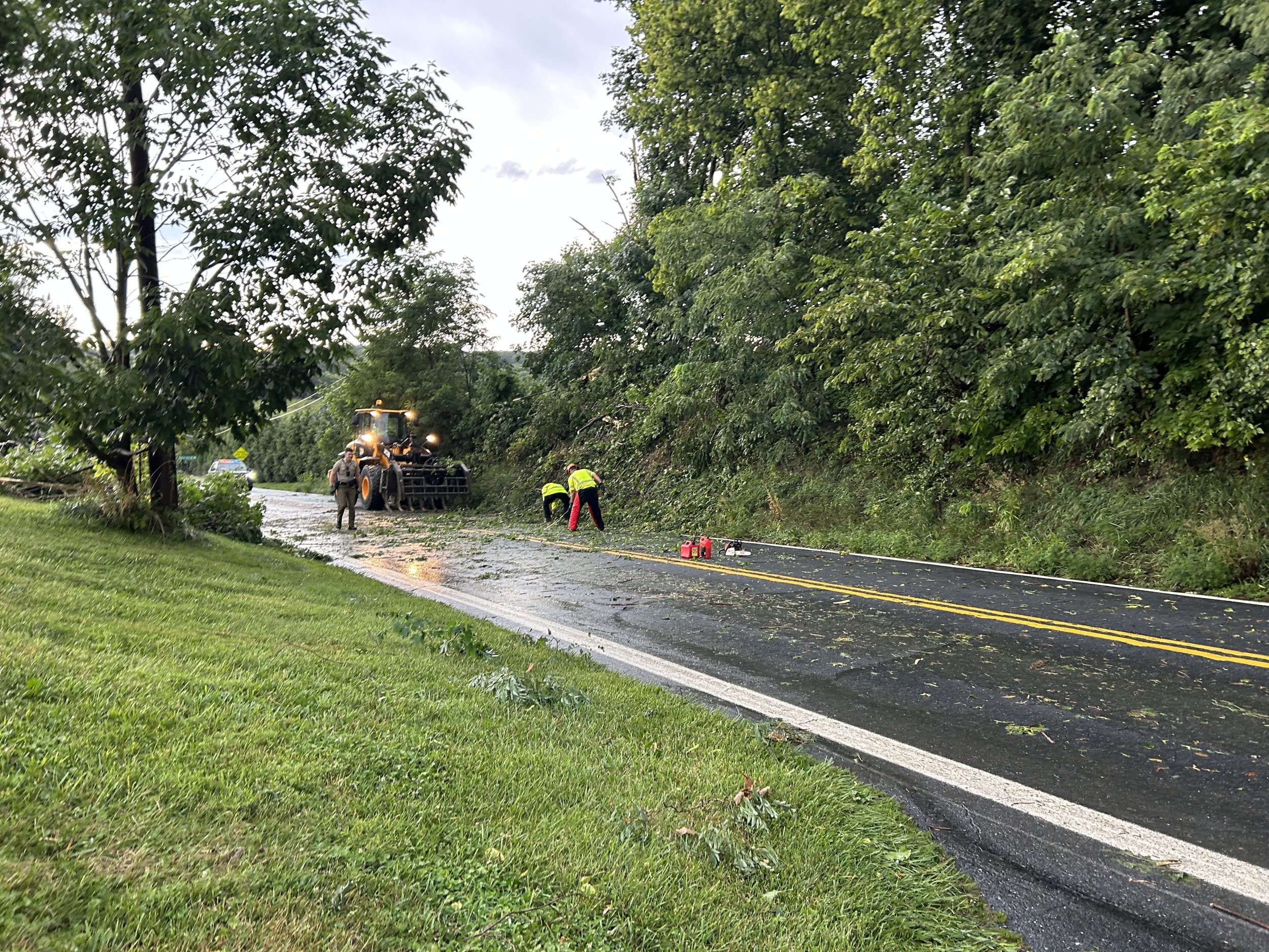 No power. Tree down on road in front of house, but that’s only phone lines there. State cutting it now.