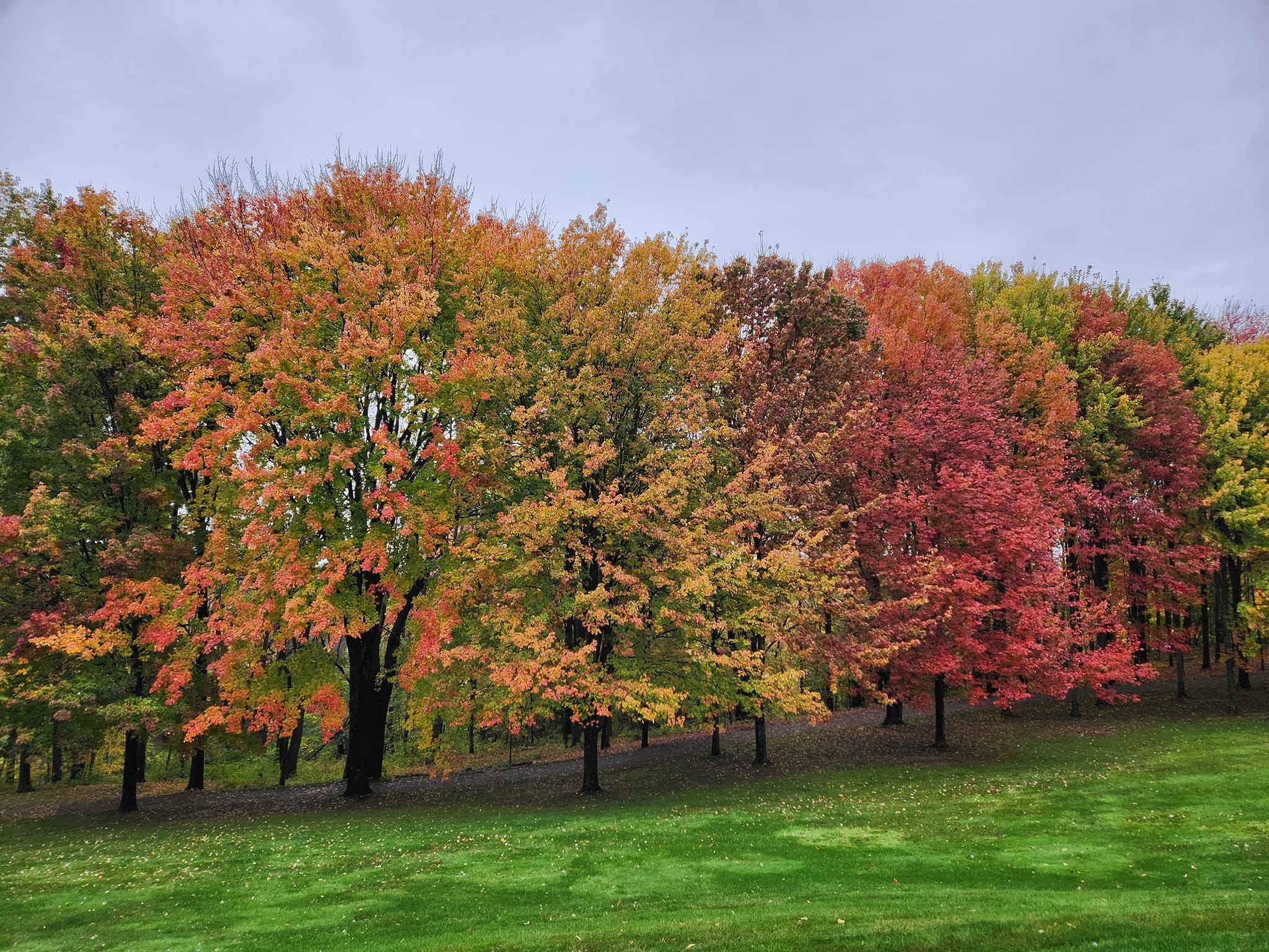When I came back from lunch, I decided it was dry enough to mow, so I got the tractor out and backed up to the mower, only to find a flat tire. Fortunately, I was able to jack it up and inflate it, it seems to hold air just fine. Go figure. Got everything mowed, leaves are getting some color and departing the trees.