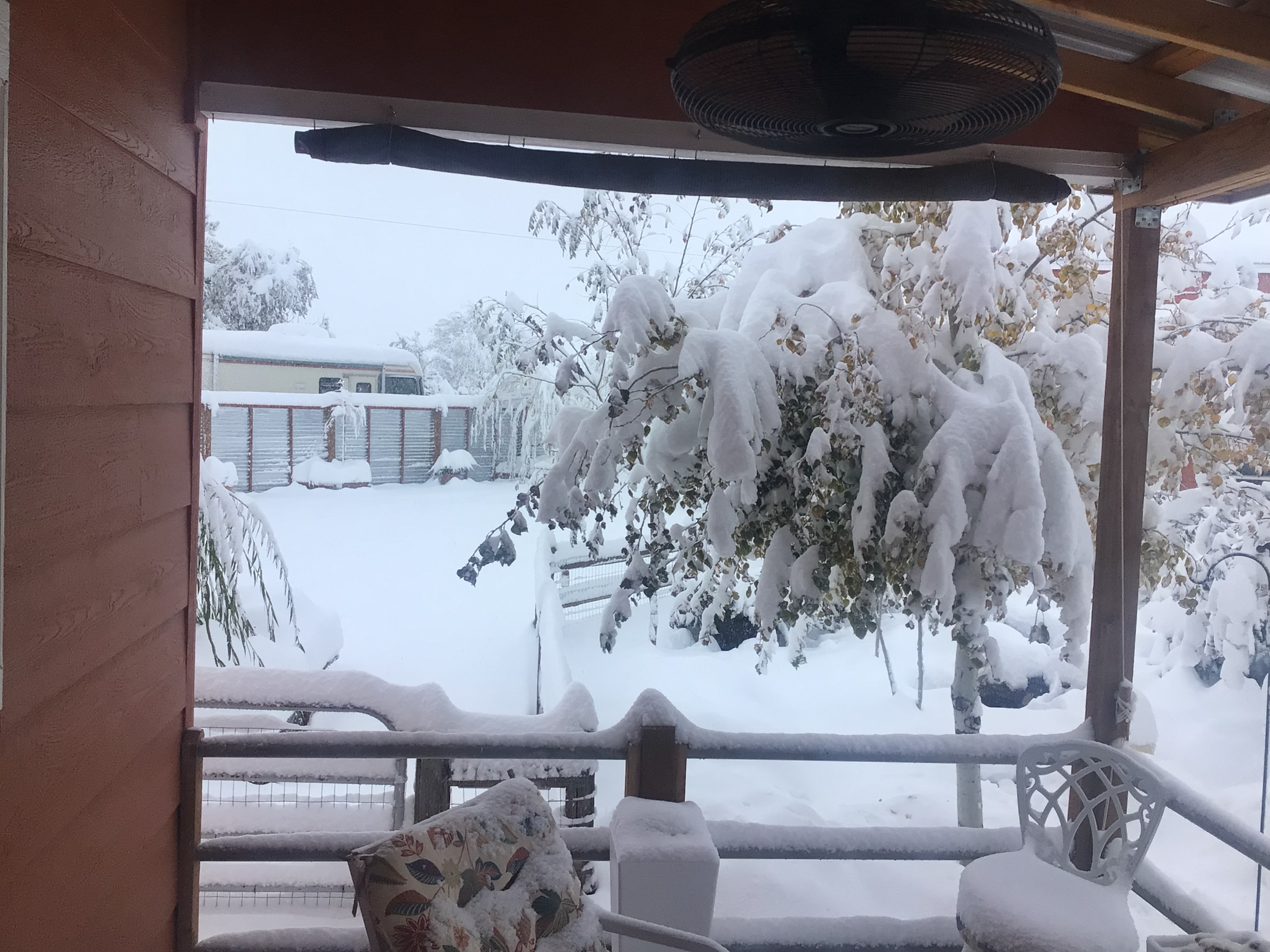 Current temp is 27°, going up to a whopping 31°. Still snowing, heavy wet stuff. I spotted a couple of broken branches already. Trees are really bending over. Power has gone out multiple times, but only for a few minutes each time. Hopefully no long term outages happen.