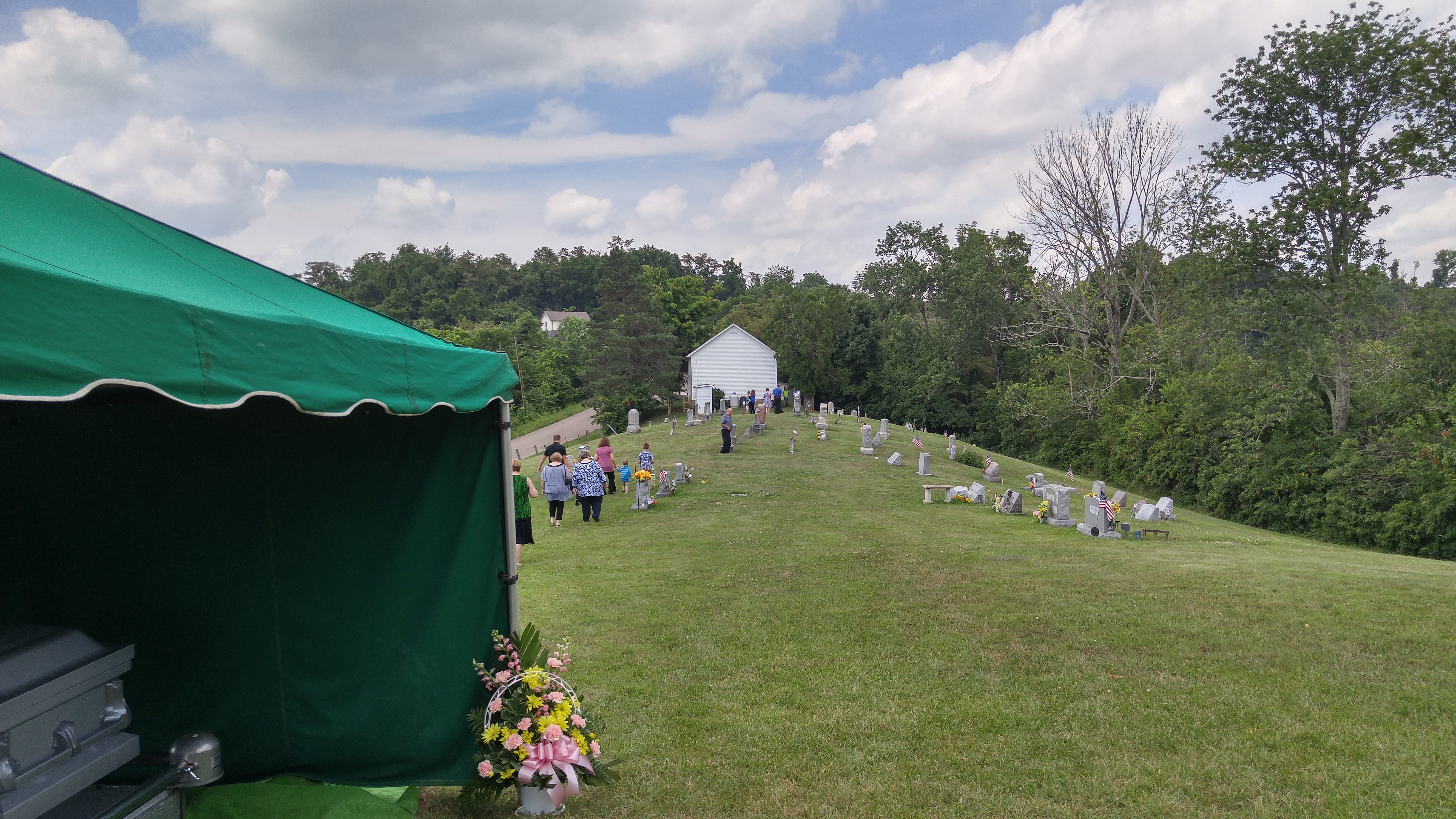 Burial was at the back of the cemetary at the little one room country church they attend, same one my maternal grandparents attended. Sign on the front says 1840, and it still has a functional outhouse out back.