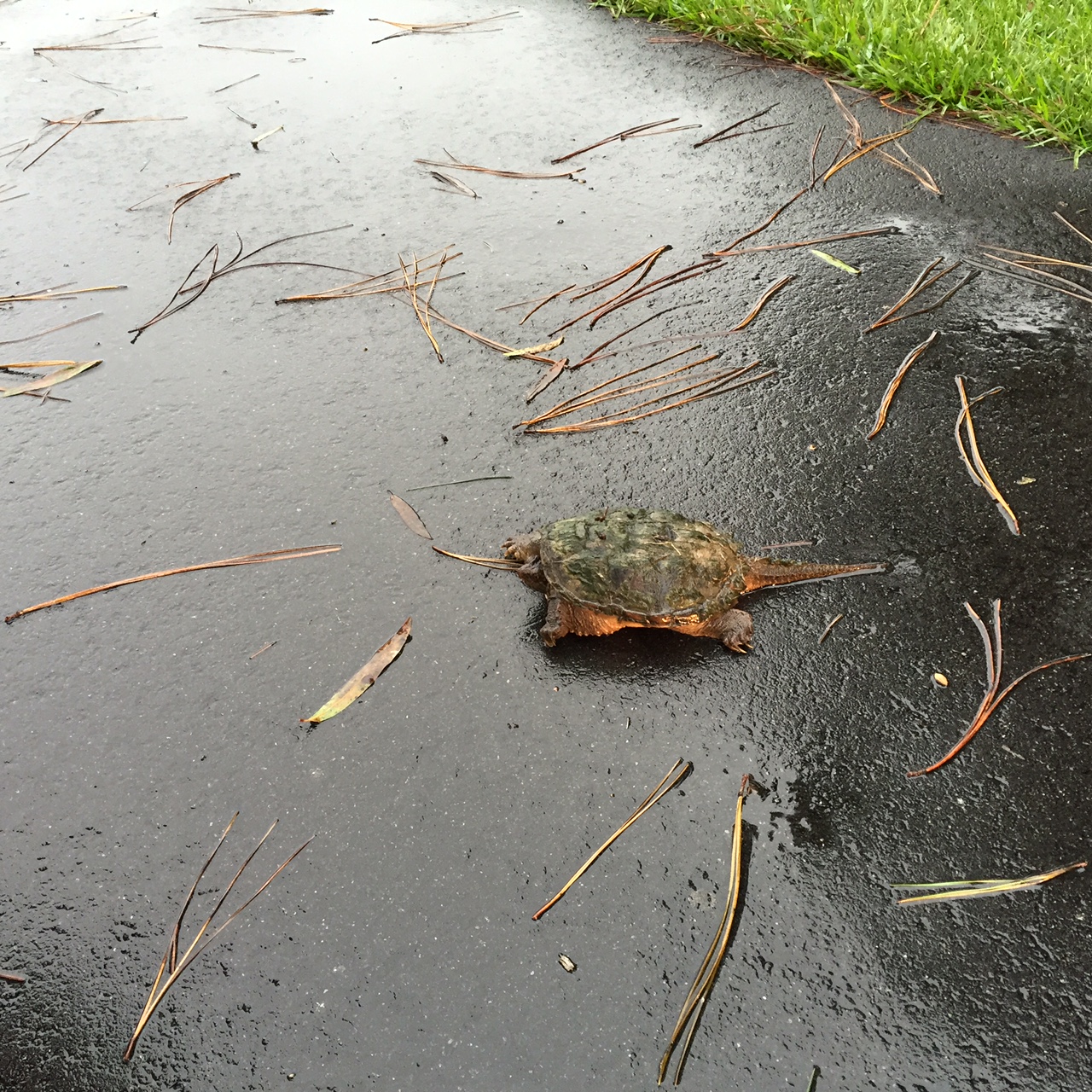 SNAP. Oh boy, no box turtle this one, neck shot out and went for my finger in lightning speed. Ah, you are a little snapping turtle, not a box turtle. Several attempts to get him picked up were clearly dangerous so he got moved with a shovel.