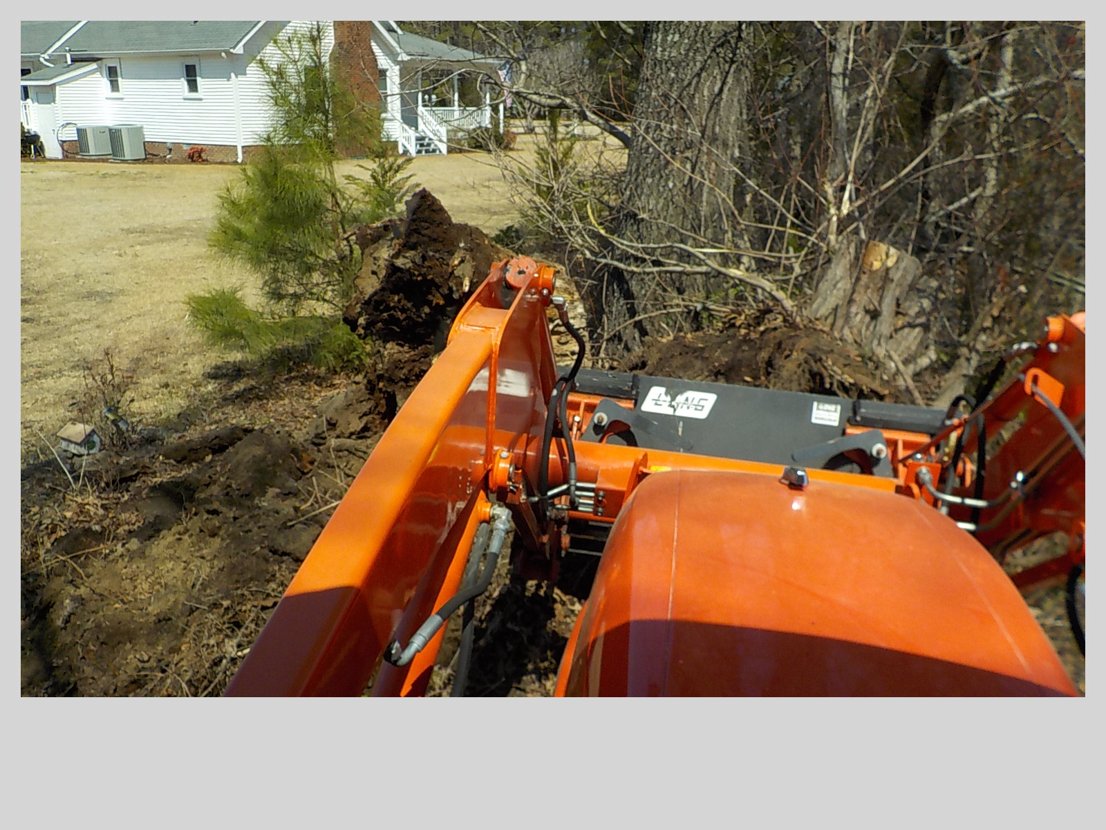 When I got home my two firemen helpers were here working on a long list of jobs, including weedeating ditches, so I took advantage of their strong arms and had them put my full weight box on the Kubota and the mower on the Massey. Then I put the WR Long tree scoop on the front of the Kubota (front implements are easy for me) and attacked an old red oak trunk. Great fun, it came apart pretty easy with the tree digger, then I swapped that out for the grapple and pulled the stump out in two pieces. That stump was overdue for attention and now the entrance to the nut orchard is not so messy.