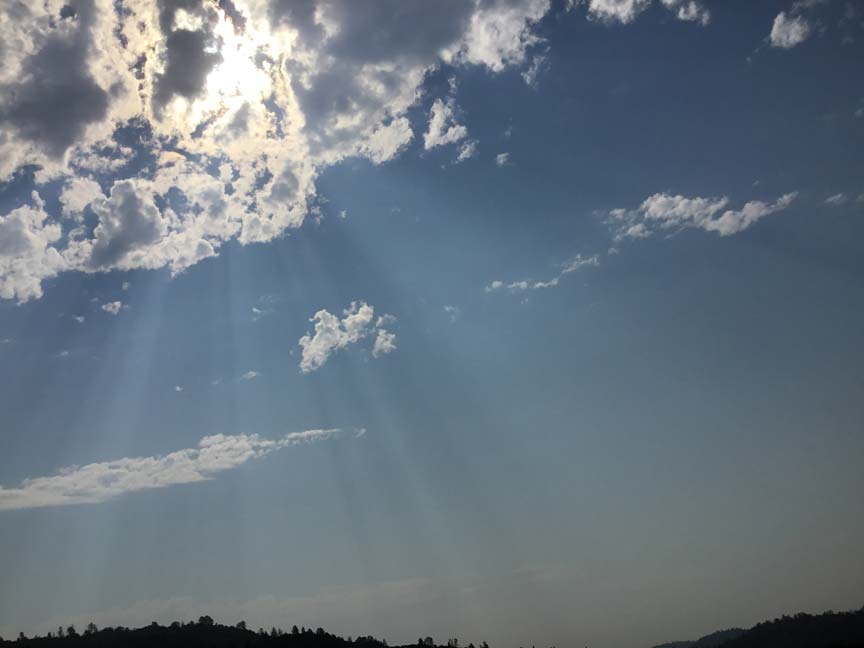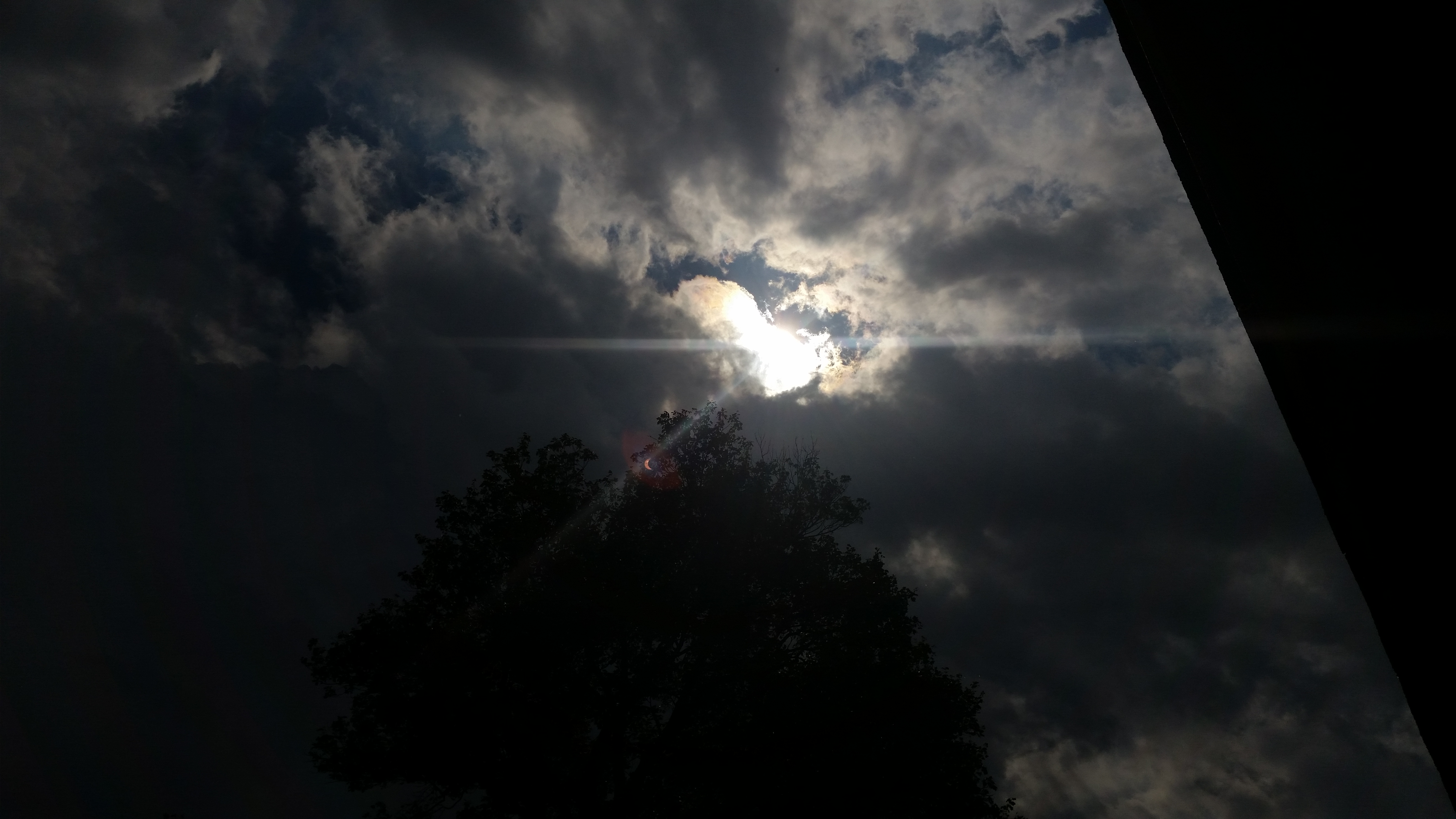 Just as we got 10 minutes before peak eclipse, the sky darkened...by a big thunderstorm. The effect of the eclipse was not really noticed. I did get one shot about 20 minutes past peak as a hole opened in the clouds. See if you can find the eclipsed sun in this shot. It's not where the brightest light is. You will need to zoom in.