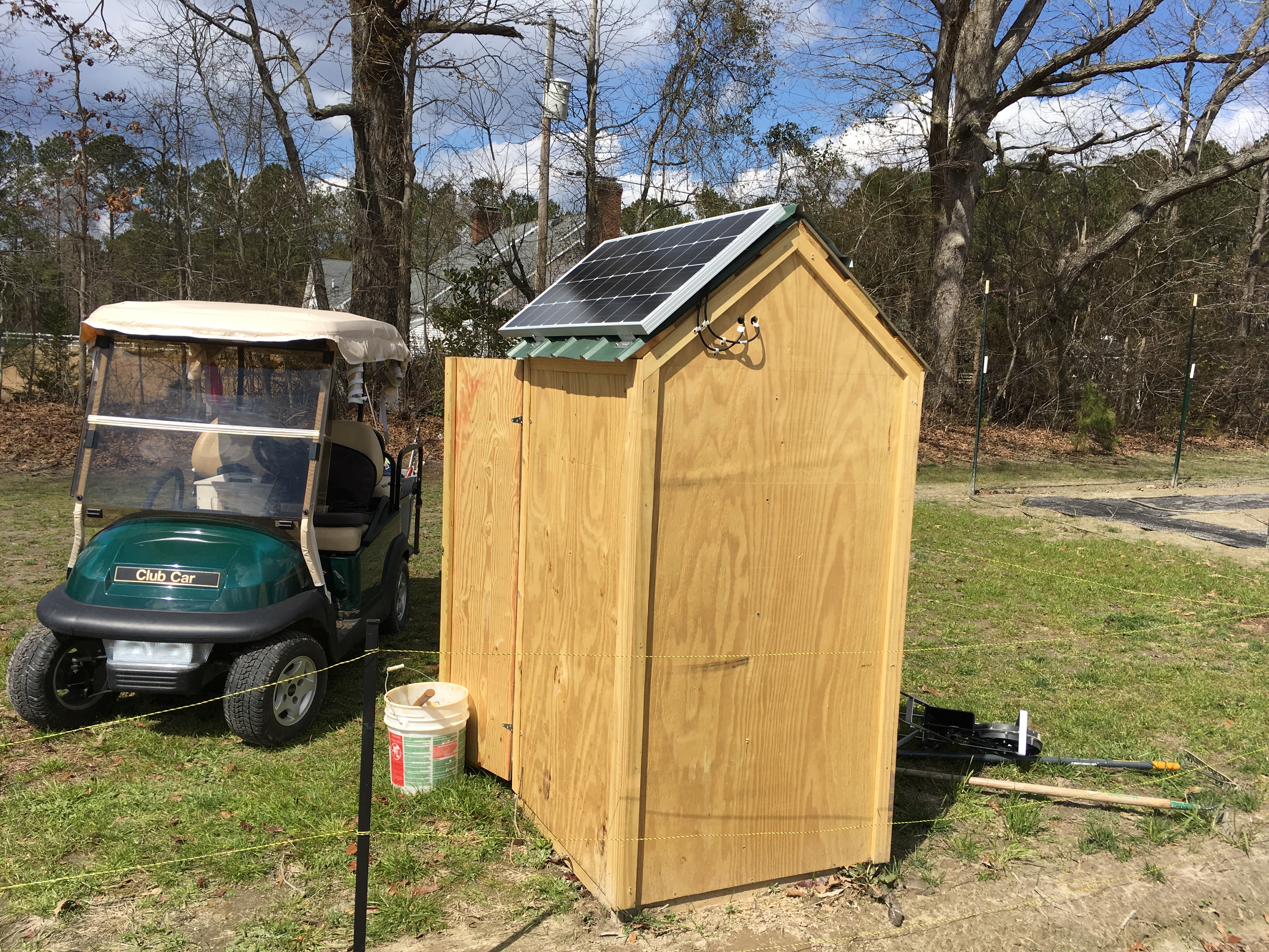 Solar charger pretty easy to install, just took my time and self tapping screws bit into metal roof nicely.  Have no idea if the angle is optimized, if need be, I suppose I could turn the building a little.  I need David/Sodamo here as a consultant for sure.  But the winky lights went on, and I went ahhhhh.