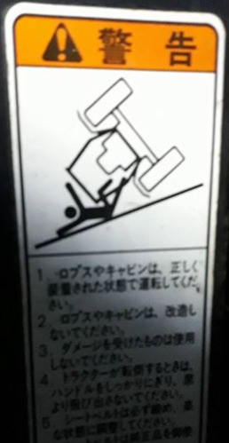 There is a warning on the roll bars about flipping. Only thing I can understand is the "!". I've got a couple of friends who know Japanese. If they have time to take from their theology studies and computer programming respectively, maybe they can tell me the gist of some of these warning labels on the tractor.