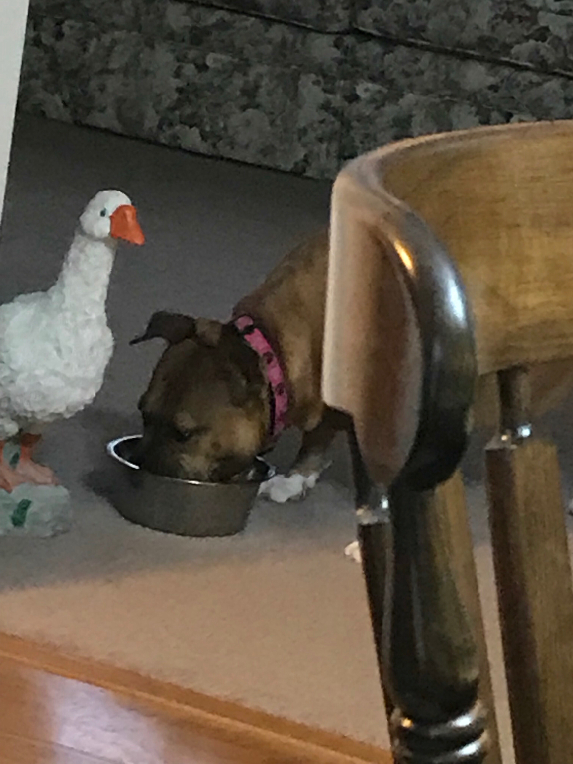 She is smart though, her bowl was sliding in the laminate so she picked it up and took it to the carpet to finish dinner the other night.