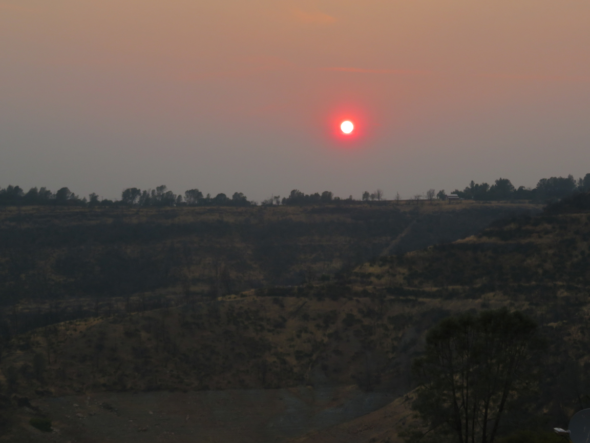 These were taken about an hour before sunset a few days ago. Not much has changed since then, and now "they" are saying that it will keep burning through the end of August. The can't put it out, and we won't get any rain until mid September at the earliest. All they can do is cut a fire line through a low fuels area and set fire to whatever is between the fire and the line. Most of the smoke we're seeing on the Carr fire is caused by these back fires. Haven't been following the River and Ranch Fires to the southeast, but the tactics are the same nationwide.