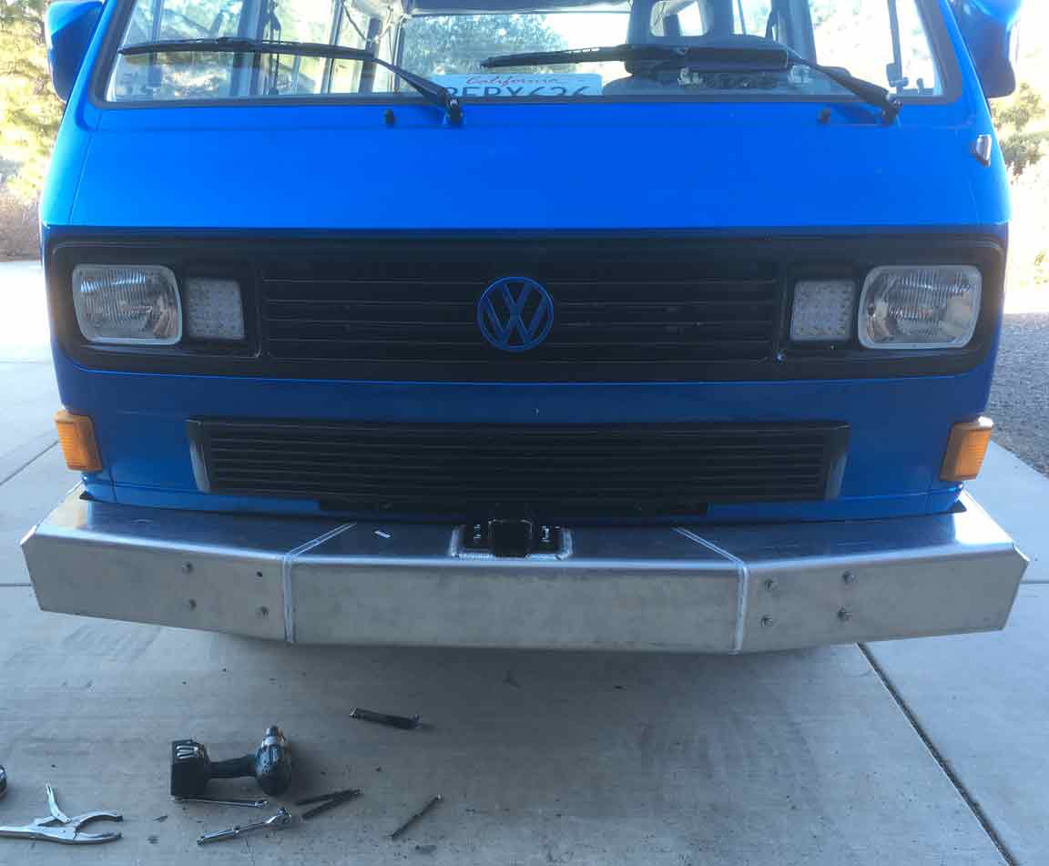 Got the bumpers out and test fit them to the Vanagon. There were no instructions or photos provided on just how that should be done, so a flurry of text messages and pics were exchanged with the fabricator to get me pointed in the right direction. Not real happy with the fit, as there are a few places where they are very close to touching the body, but a little time with the saber saw today will fix that. These were pretty much prototypes for a new line he'll be coming out with, so glitches like this were somewhat expected. The build quality is excellent, though. Heavy quarter inch thick aluminum on the outside with thick steel frame underneath. I'll smooth out the welds, scuff 'em up with the D/A sander, and shoot 'em with bed liner today.