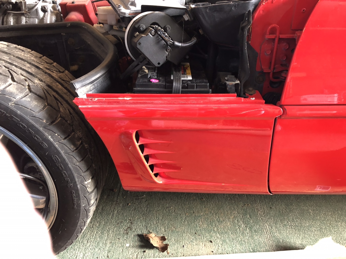 To get the battery out, you have to remove the body panel directly behind the driver's side tire. Since last battery replacement was over ten years ago I had to think a bit to remember how to remove the fiberglass body panel.