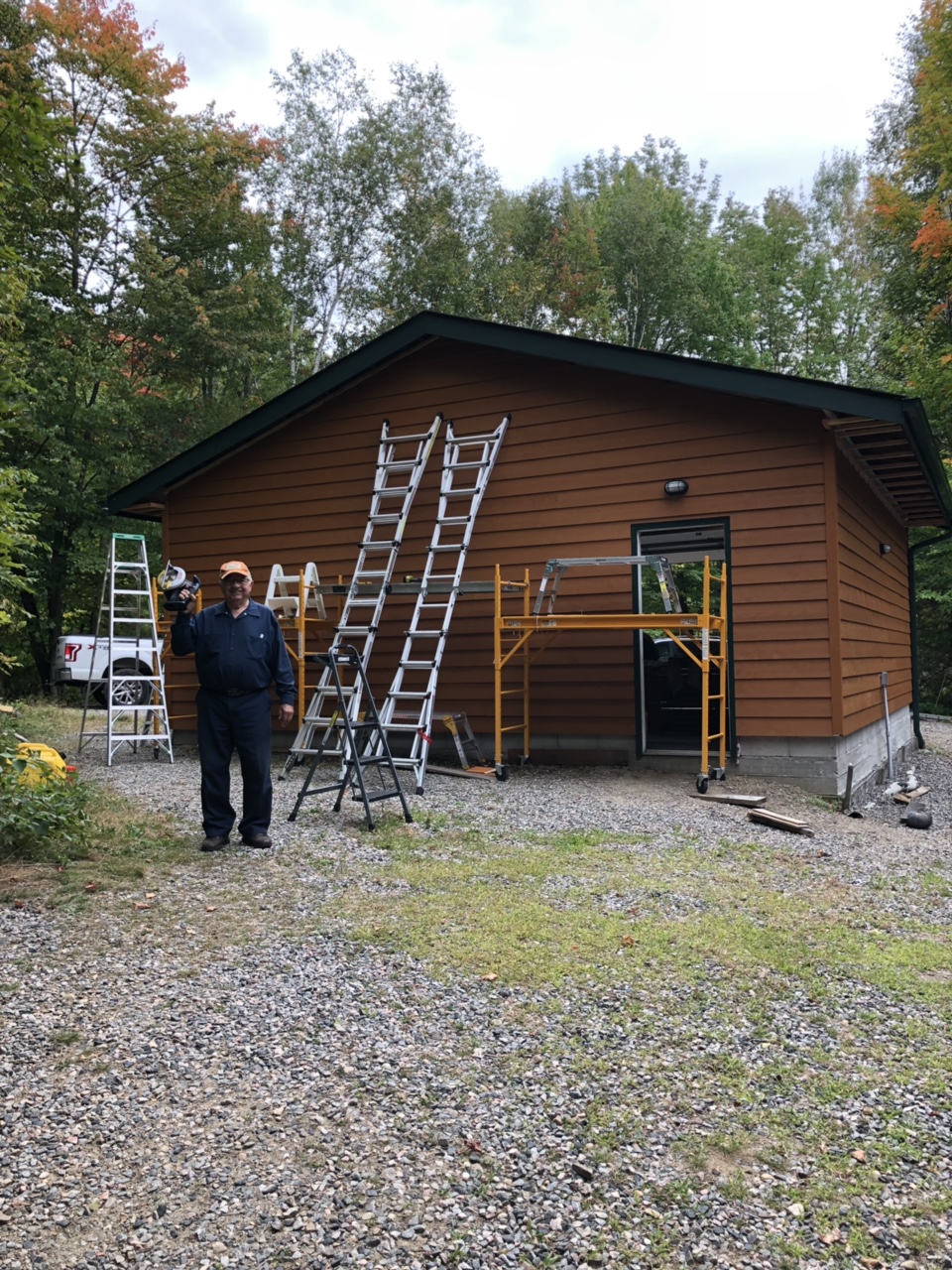 It worked! Anyway that is the last of the four walls and two gable ends, with my friends celebrating the little 18 V Skil saw I gave him.