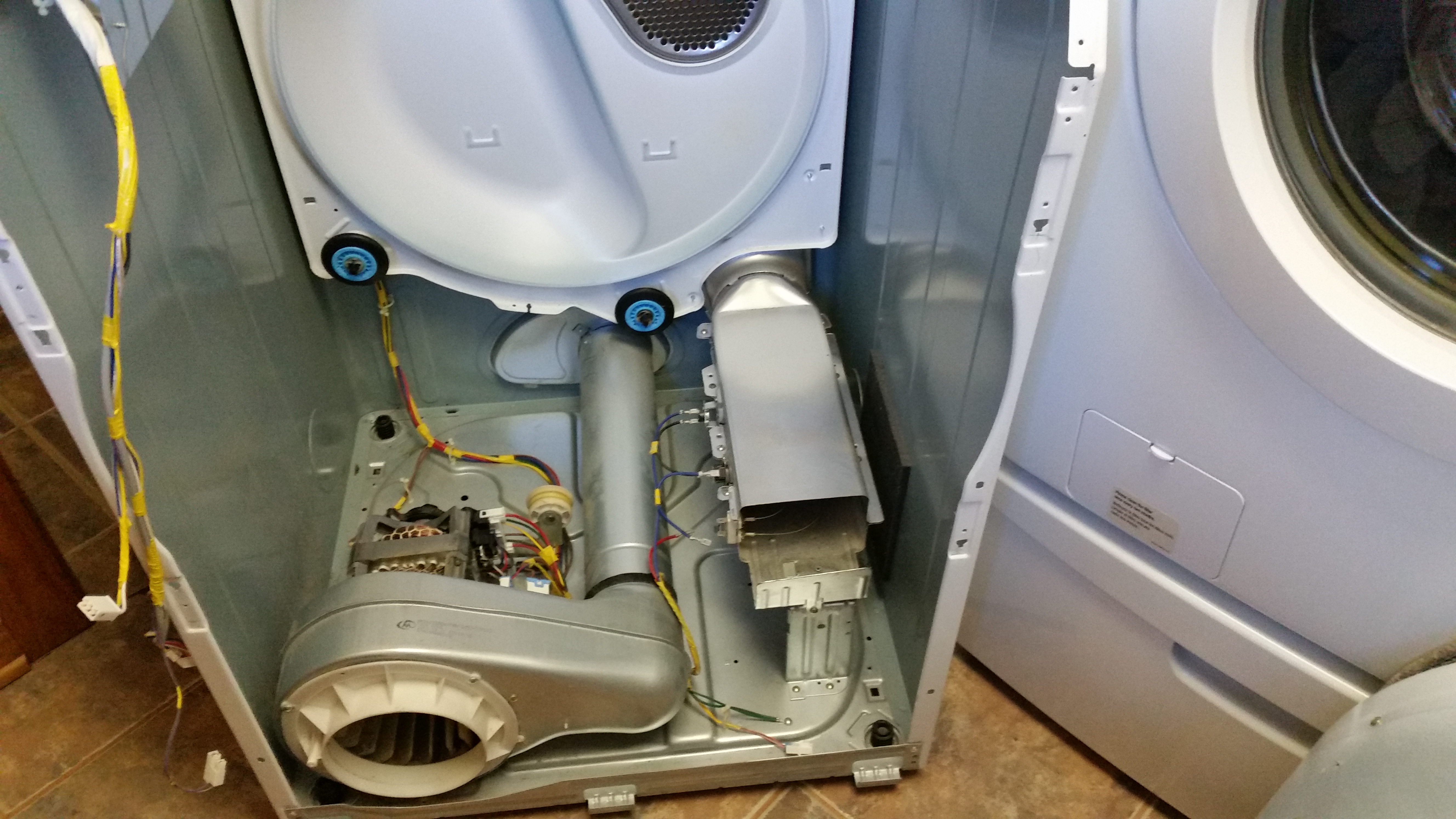 Took the dryer apart and replaced the heating element. Old one failed continuity testing. Ran out of time so reassembly today. Texted my wife a couple of pix of her dryer in pieces. Here's one of it after disassembly before I opened the heater.