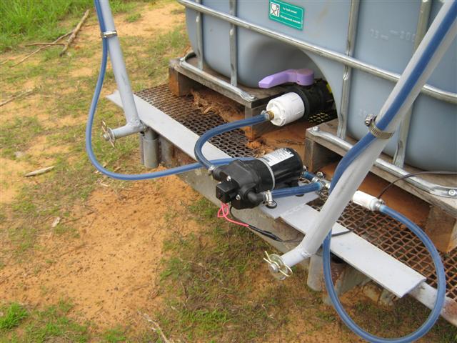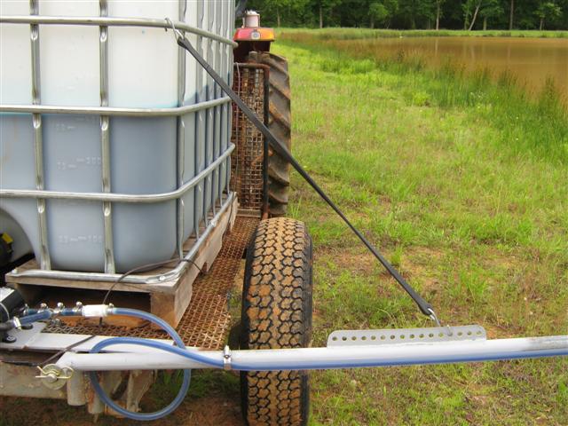 A few months ago, I bought a 275 gallon, square tank that had been used for a red colored syrup of some kind. I washed it out and put it on my ATV trailer. Then I saw some sprayer tips for sale at Northern Tool that spray 16 feet out. I put one at the end of each boom for a total spray width of 31 feet. The boom was a challenge, but the more I thought about it, the simpler it became. When I built it, I think I had it down to the very simplest design possible. I also want it to be quick and easy to take apart for storage. The pump is a 12v unit that I turn on and off with an inline 110v switch that hangs down near my ankle. The switch is really simple and easy to use. I turn it on, and I have spray coming out instantly. I turn it off, and it's not pumping any more.