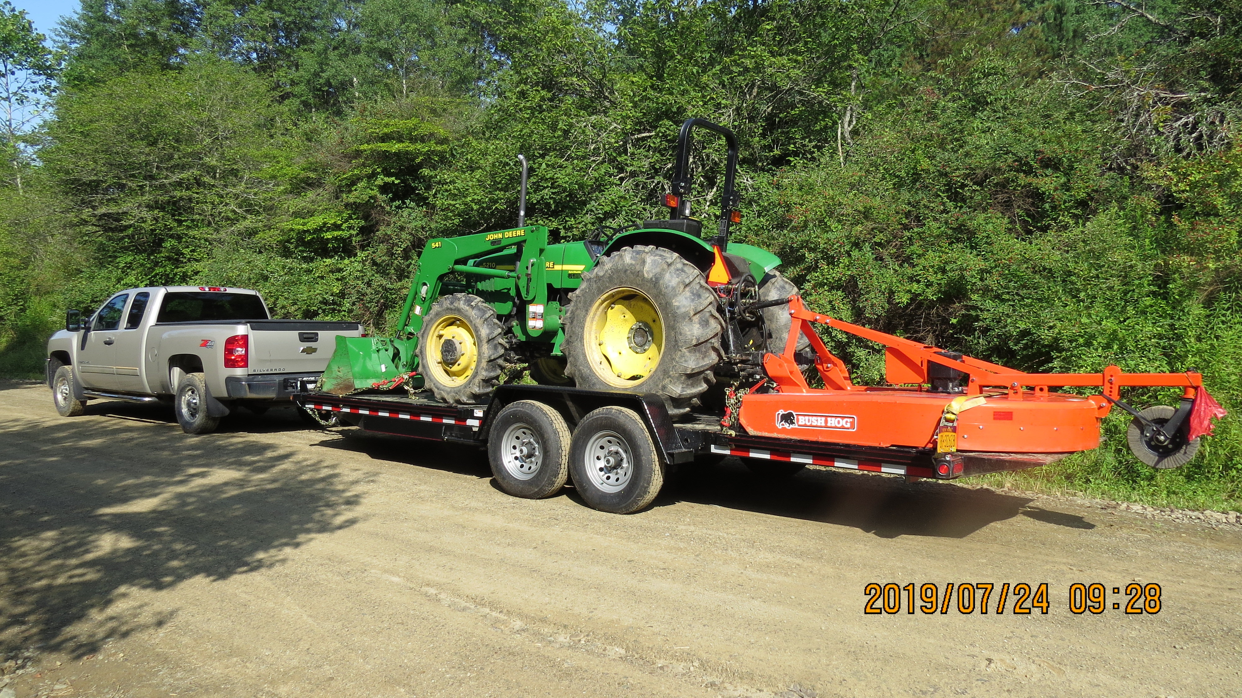 Here is a picture of the loaded trailer that was weighed. I red flagged the mower tail wheel which stuck out past the rear of my 23' trailer.